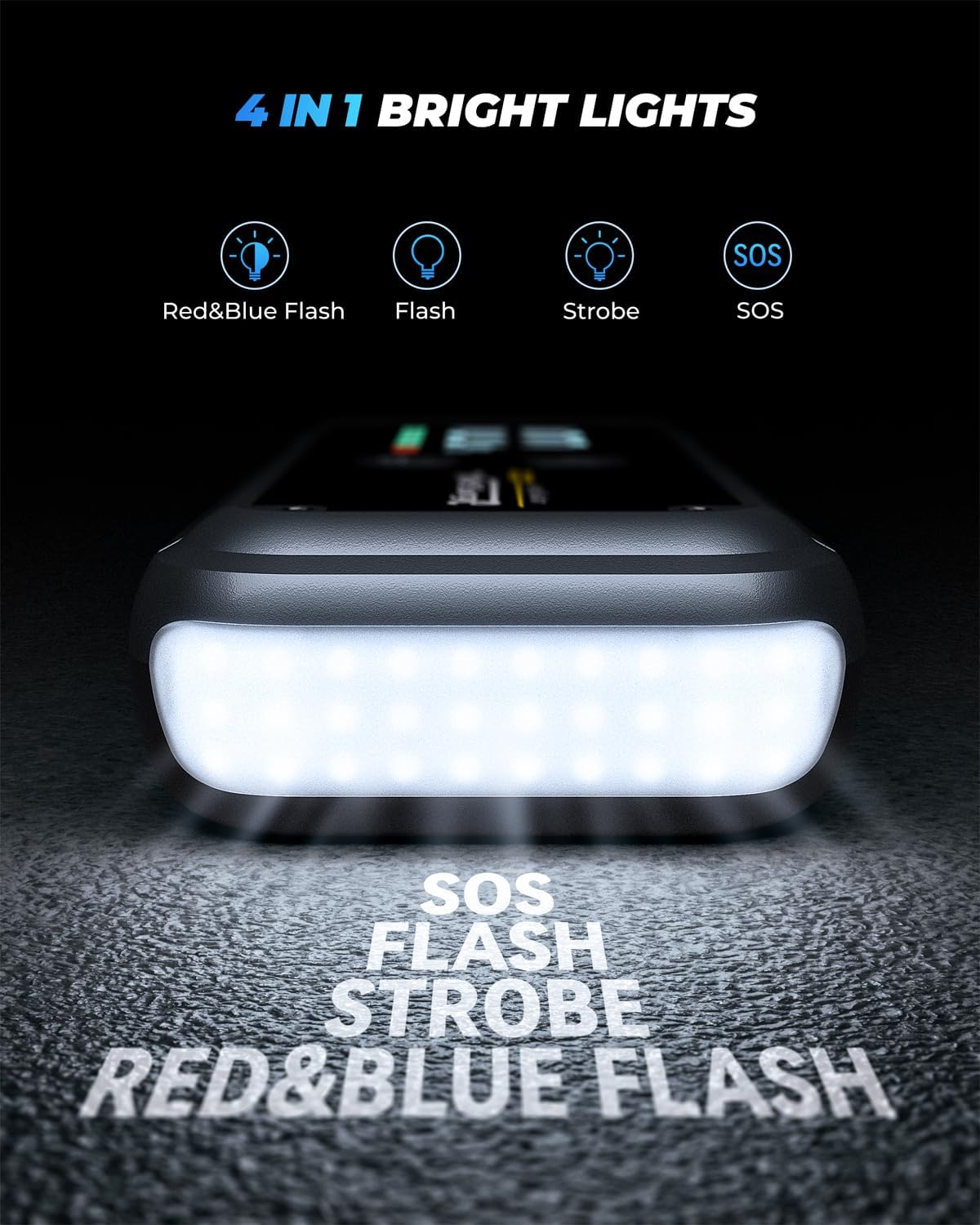 - LED light in 4 modes:The jump box for car battery is equipped with a built-in LED flashlight, which is useful in low-light conditions or emergencies. It offers 4 adjustable light modes:normal, strobe, SOS andcolored. Additionally, the jump starter provides excellent protection for use in environments ranging from -4°F to 140°F
