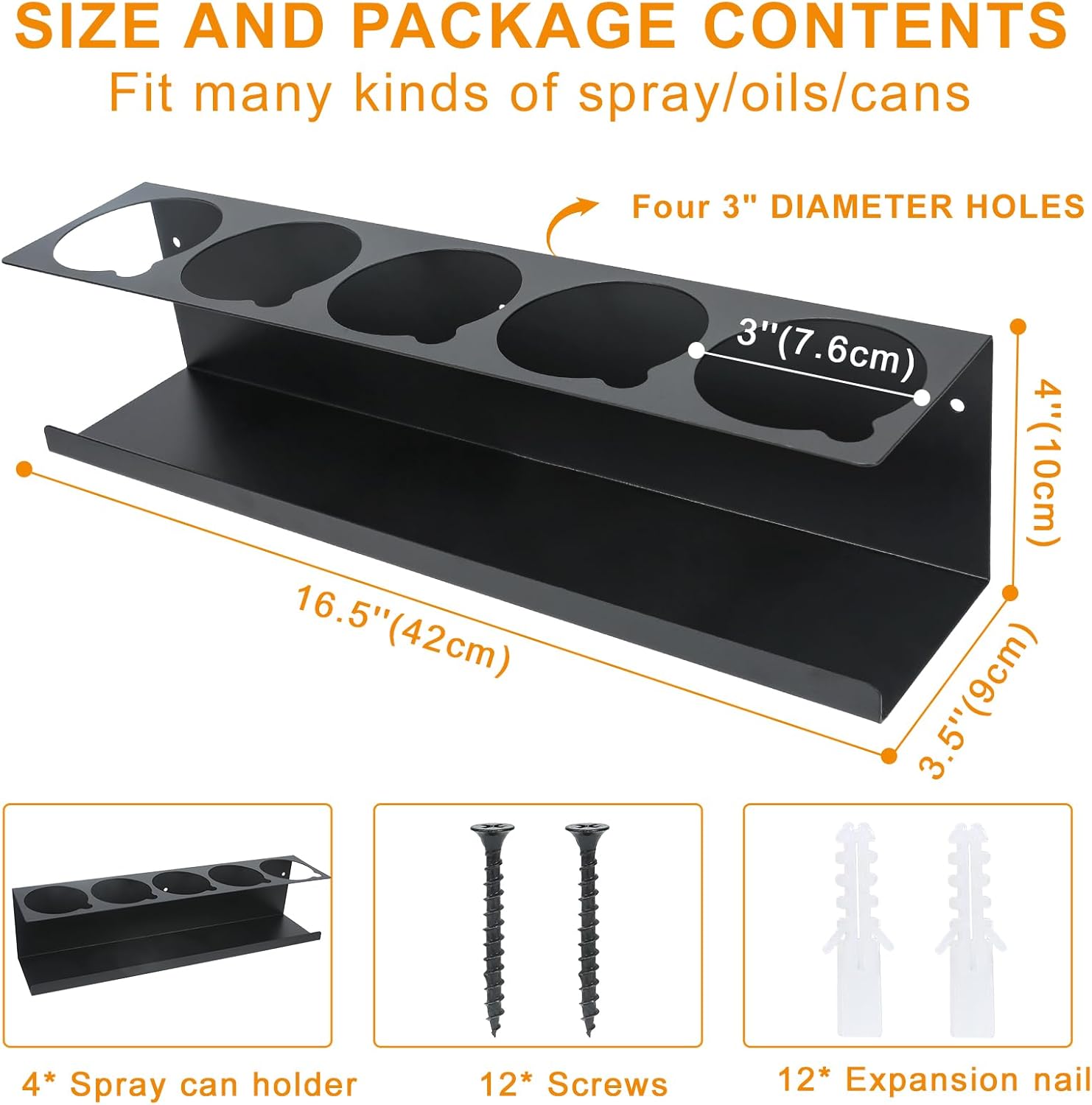 - Space-Saving Design: Each one measures 16.5" W x 4" H x 3.5" D, Diameter of the hole is 3". Maximize storage efficiency with this compact yet spacious spray can organizer! Holds up to 16 cans using these 4 sturdy racks, keeping your workshop, garage, or tool trailer clutter-free while optimizing vertical wall space.