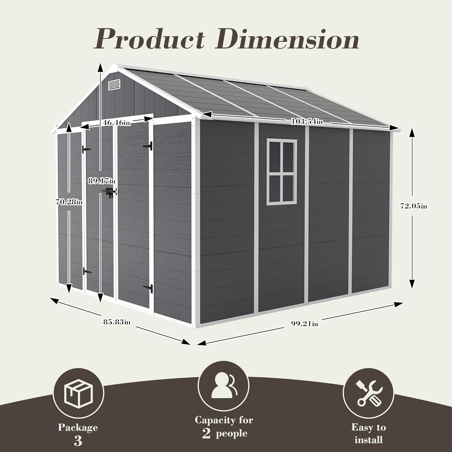 MyVoice 8x8 FT Outdoor Resin Storage Shed with HD Window, Rustproof Waterproof Garden Tool Shed, 12mm Thickened PP Panels, Large Capacity Outdoor Utility House for Backyard Patio (with Floor)
