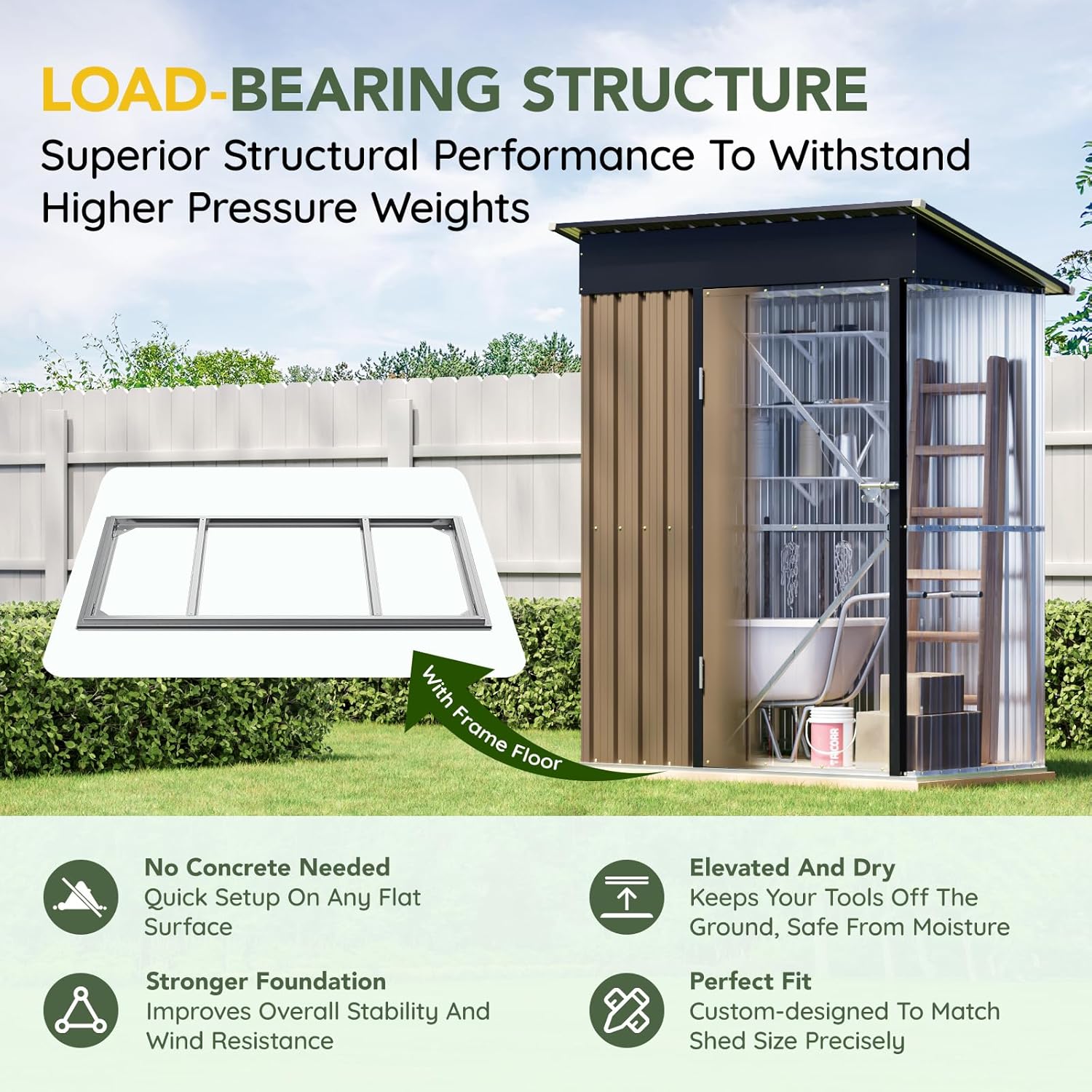 5x3FT Outdoor Steel Storage Shed with Floor Frame, Lockable Doors, Compact Metal Tool Shed for Garden, Backyard, Patio, Utility, and Bike Storage,Brown