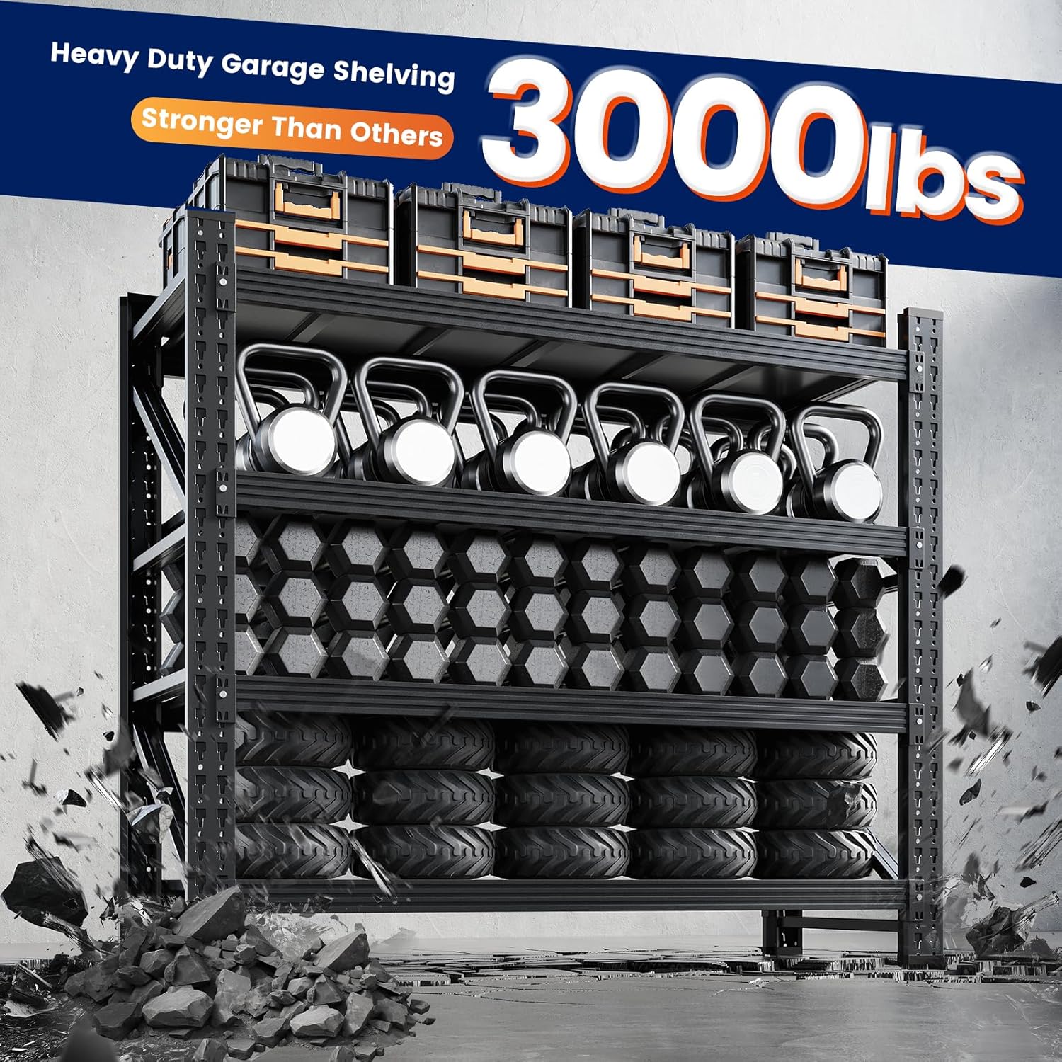 - 【Adjustable 4-Tier Shelving】Our heavy duty storage shelves are as flexible as your plans.This garage shelves height of each layer could adjustable by moving the crossbar up or down,to meet the different heights of varied objects needed and customize your own space!
