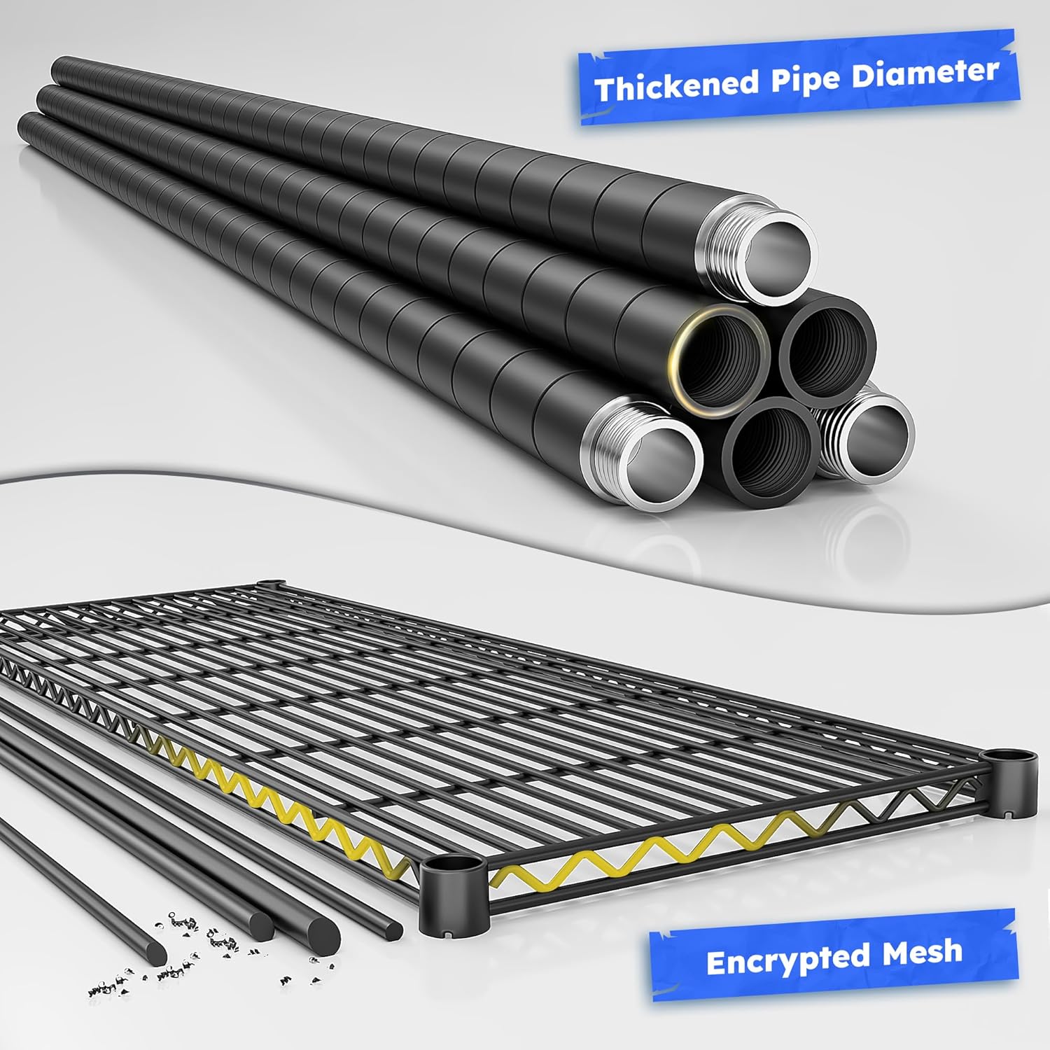 - 45”W Extra-Wide Storage Shelves:Our wire closet shelving measures 45”W × 13.5”D × 59.4”H—offering nearly twice the capacity of standard black shelves. The 45-inch ultra-wide design easily stores bulky kitchenware, toolboxes, green plants, bulk food packs, seasonal clothing, files,books and more, making it perfect for home or commercial use.
