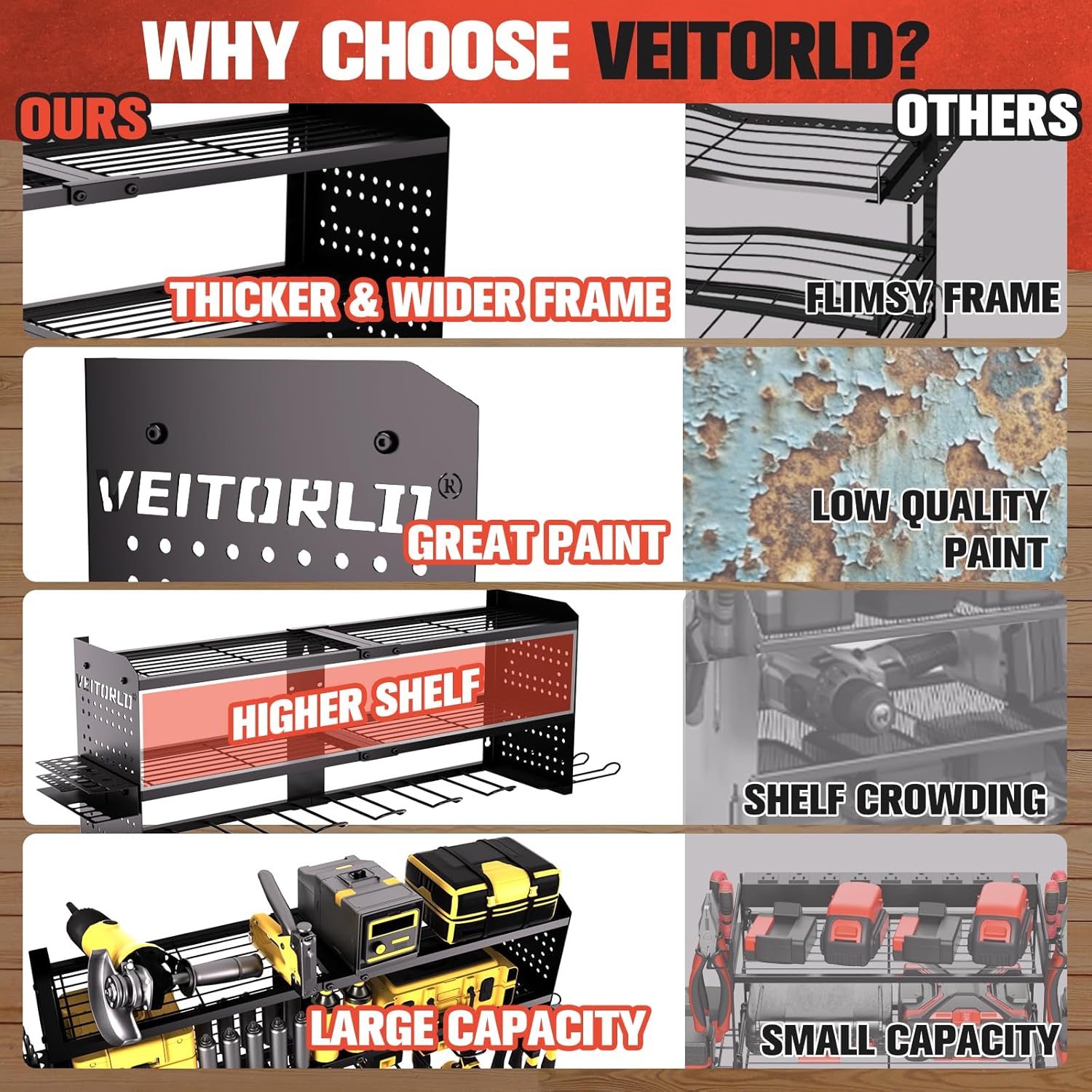 - 2025 Upgraded Version: The wall-mounted power tool rack is 12.8 inches high, providing more space than other tool racks. The weight has been upgraded to a sturdy 9.5 pounds, thicker and stronger metal has been used to increase its load-bearing capacity