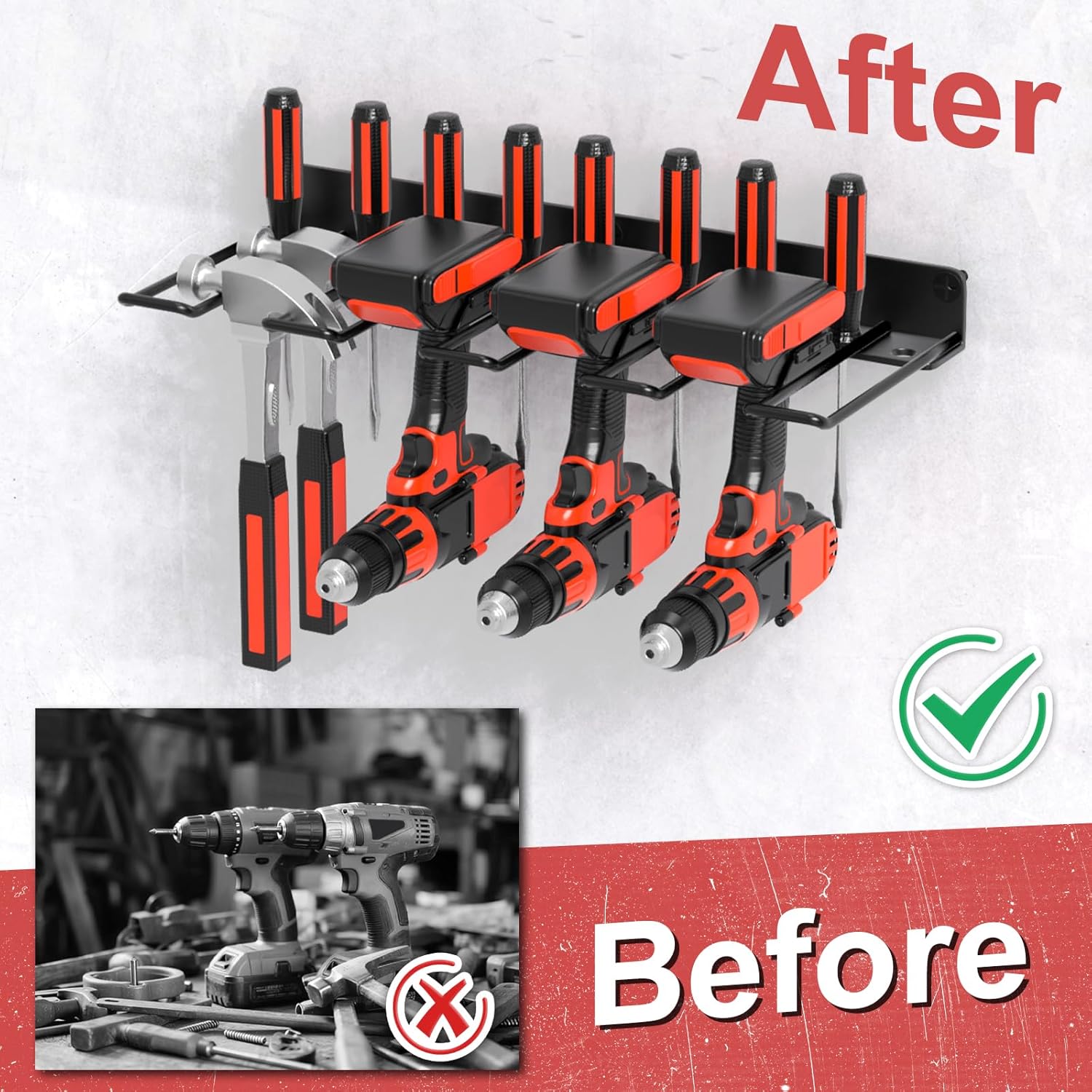 - Installation Easy: The installation process of the wall-mounted electric drill stand is very simple. Simply mark the holes and mount the organizer on a concrete, stud or wood wall.