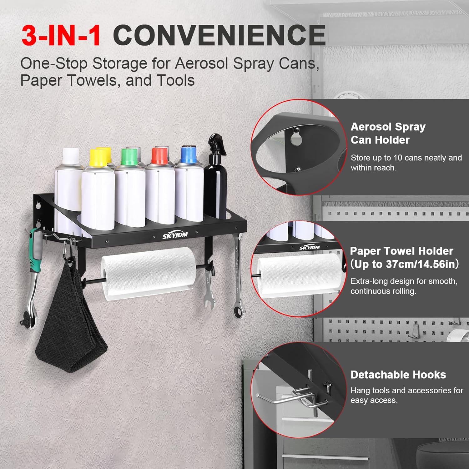 10 Aerosol Spray Can Holder with Paper Towel Holder & 4 Detachable Hooks, Space-Saving Tool Organizer Wall Mount for Garage, Workspace and Tool Room