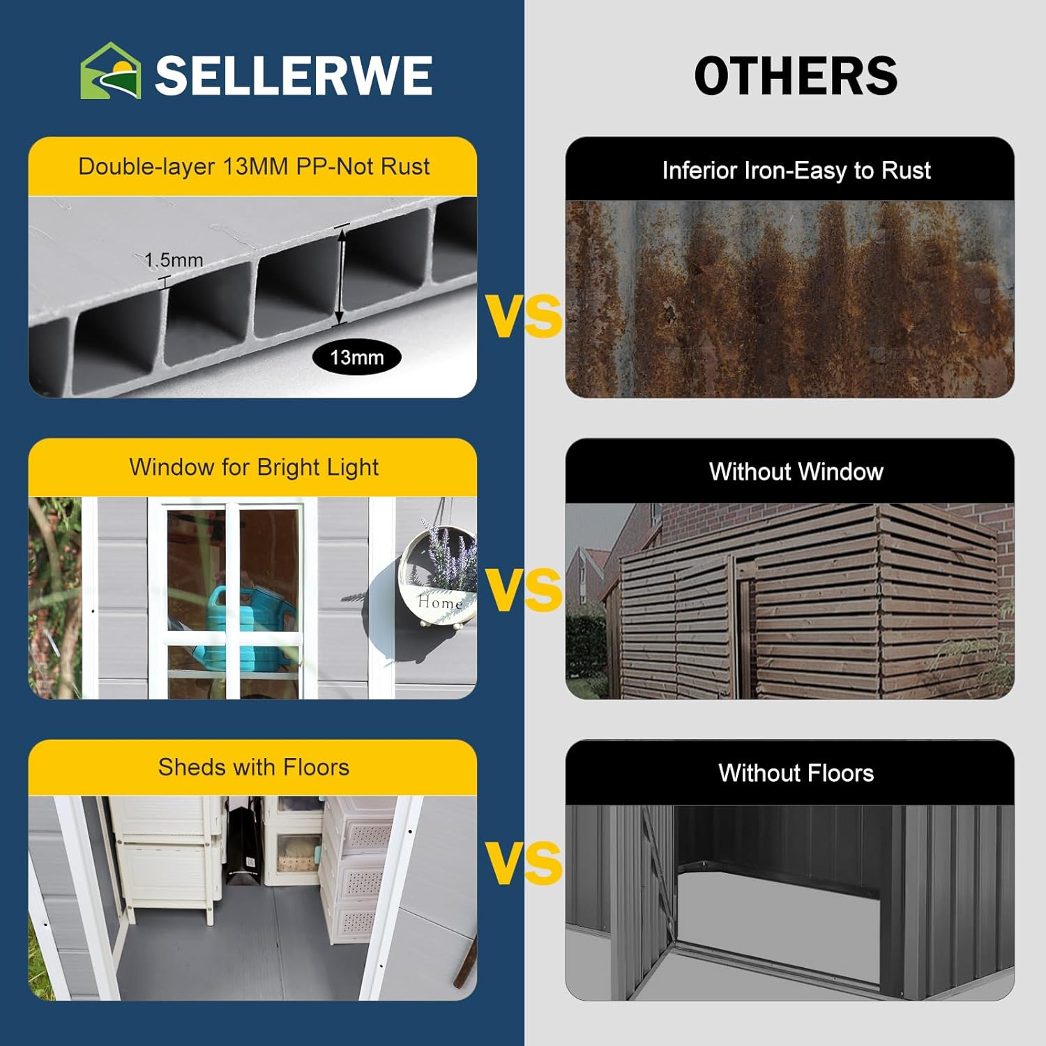 - 🏡[PREMIUM MATERIAL STORAGE SHED WITH FLOOR]: The 12mm tough double-wall resin construction and impact-resistant floor are designed for long-term durability. The double-wall panels are waterproof and moisture-proof, allowing worry-free use in all weather conditions. It is weather-resistant, waterproof, and UV-resistant—no peeling, rotting, or rusting. The screws are embedded to ensure aesthetics and safety.