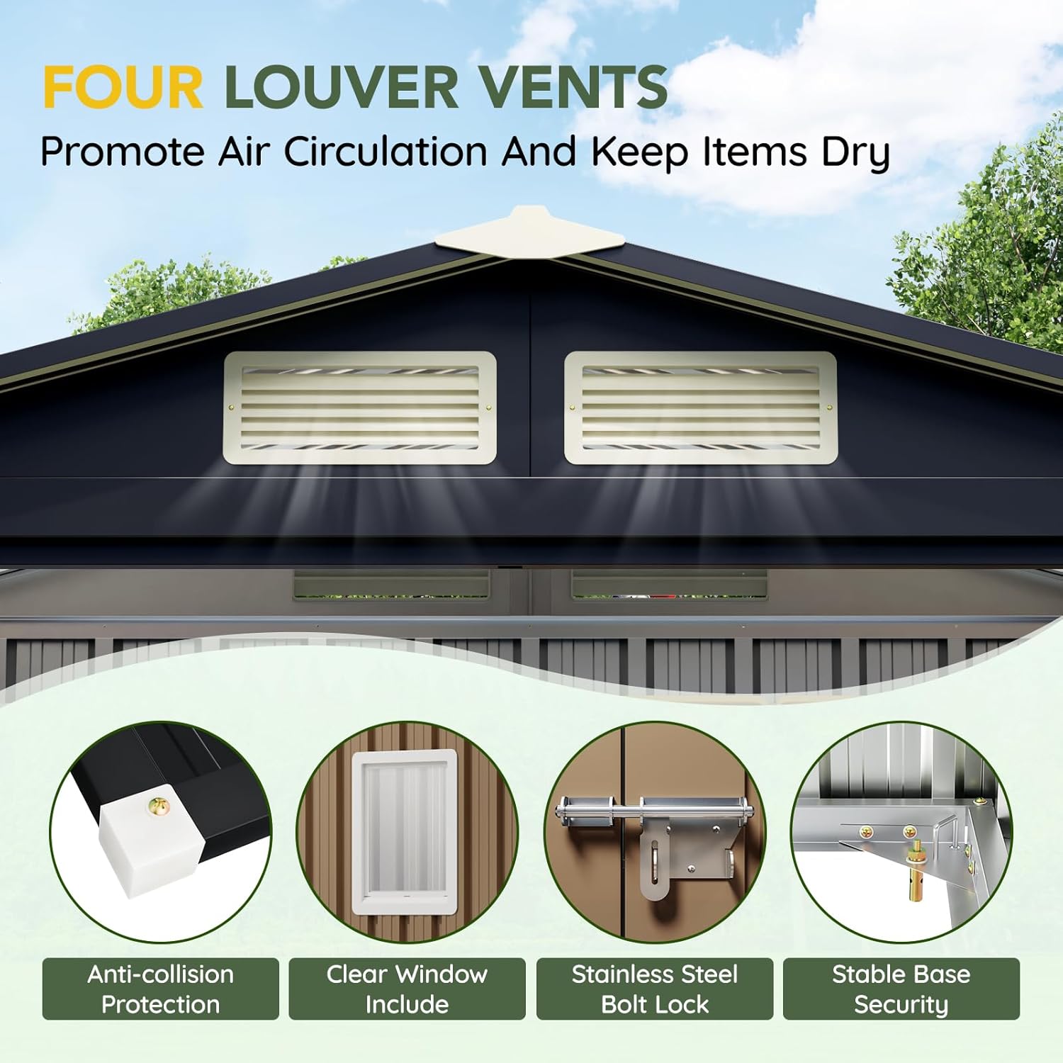 - Durable Construction: Crafted from galvanized steel, this shed is rust-resistant and weatherproof, ensuring long-lasting durability even in tough outdoor conditions.