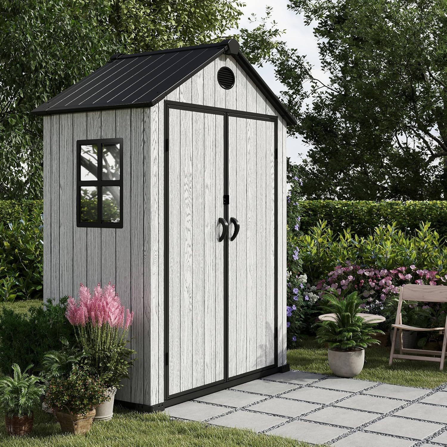 5.3x3.4 FT Resin Outdoor Storage Shed, 135 Cuft Garden Tool Sheds & Outdoor Storage Plastic Shed with Floor, 7FT Tall Backyard Outside Lawn Mower Storage Shed with Side Window, Cemented Grey
