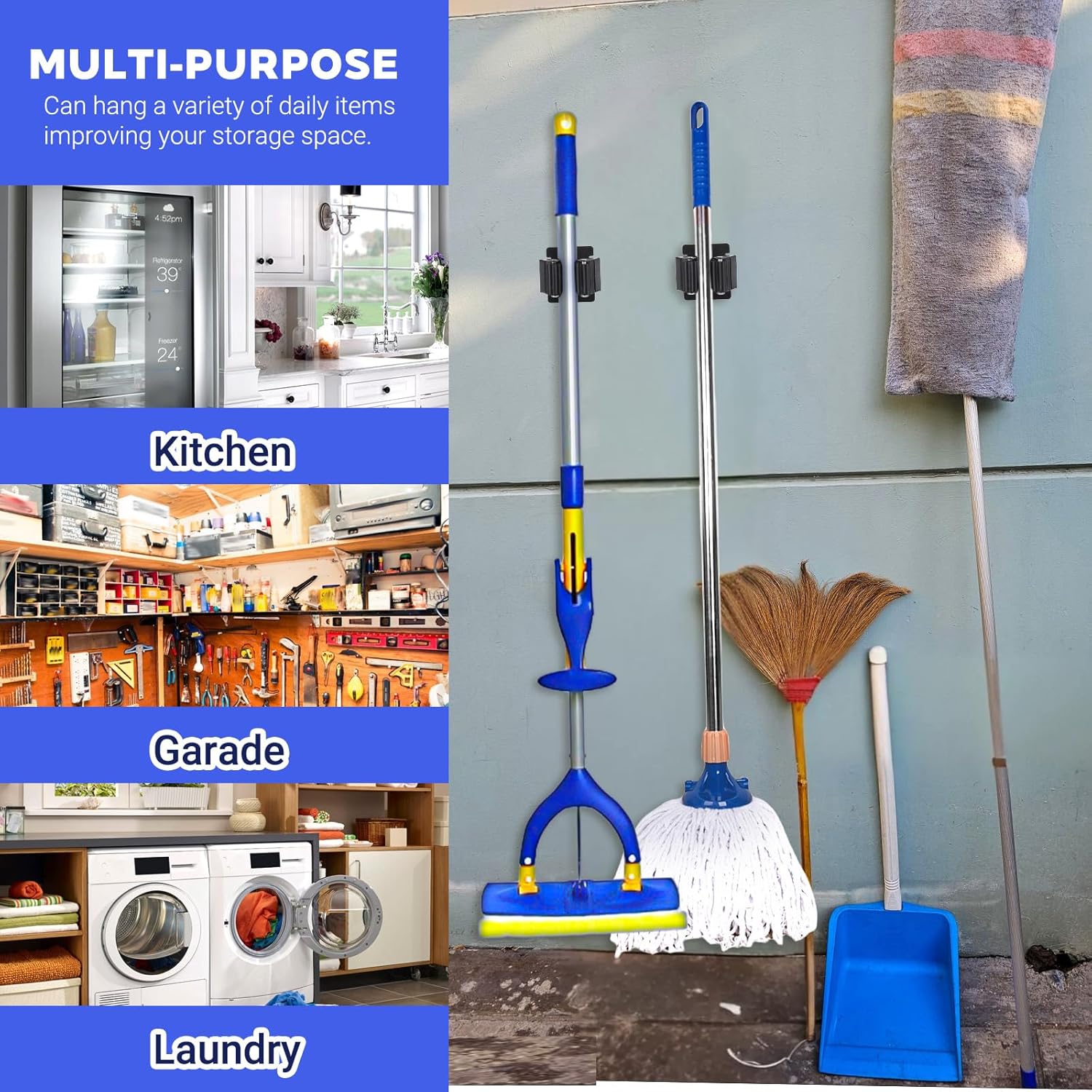 - 【Heavy Duty】Our mop and broom holder wall mount is designed to hold up to 12lbs, making it perfect for organizing various cleaning tools. The anti-slip design ensures your brooms and mops stay securely in place, preventing afalls or slips. Ideal for use in garages, kitchens, RVs, and campers