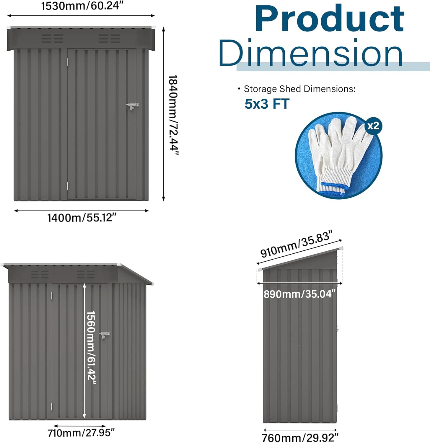 - 5X3 FT Outdoor Metal Storage Shed - 5X3FT (approximately 60.24×35.04×72.44 inch), suitable for balcony and courtyard corners. It can easily accommodate garden tools, sports equipment and daily miscellaneous items. The internal space can be equipped with shelves and hooks to achieve orderly and categorized storage.