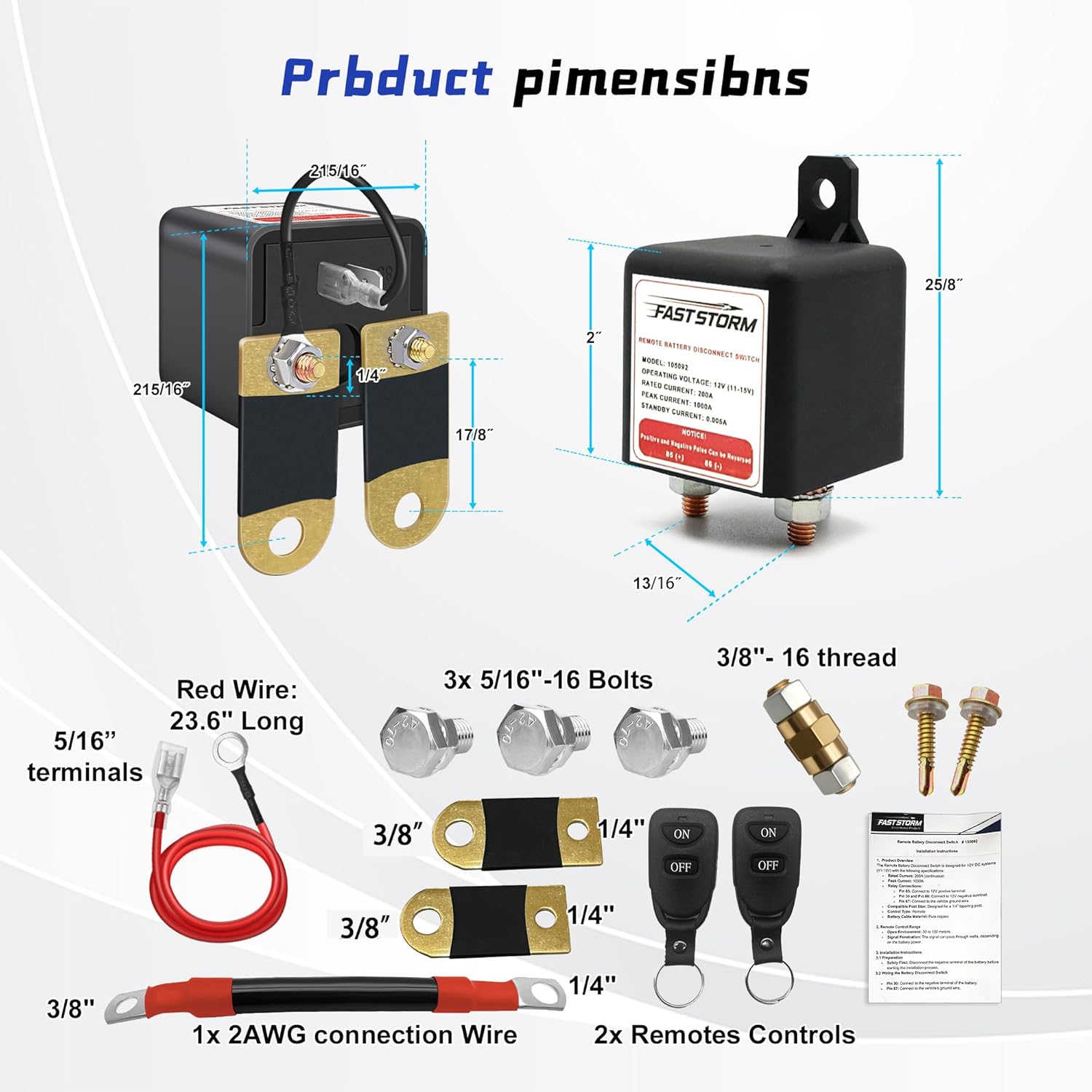 - 【Complete Kit for Effortless Setup】 This 12V battery disconnect switch delivers one-tool installation with a step-by-step guide and visual wiring diagram. The kit includes everything you need: Relay Switch with Wire Harness, 2 Remotes, 1 3/8"Side Post Adapter, 1 Connection Wire 2AWG, 2 3/8"Copper Bars, and 3 Bolt 5/16" Thread. The red/black wires attach to battery positive/negative poles, while the relay’s stud terminals link the battery’s negative post to your vehicle’s ground wire