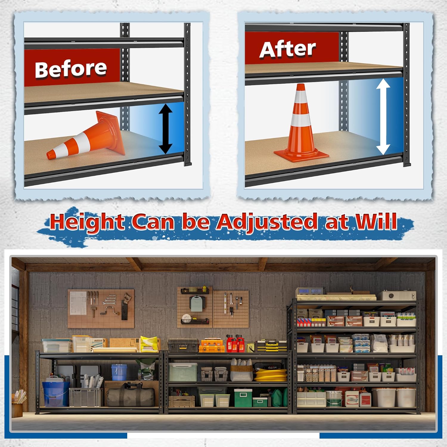 - 【Modular Adjustable Storage Shelving System】 Customize this industrial shelving system to meet specific storage requirements. The shelving unit features tool-free connectors, allowing vertical repositioning of cross braces for tier-height adjustments. This design accommodates items of varying dimensions and enables you to assemble or disassemble our metal shelving into two different units