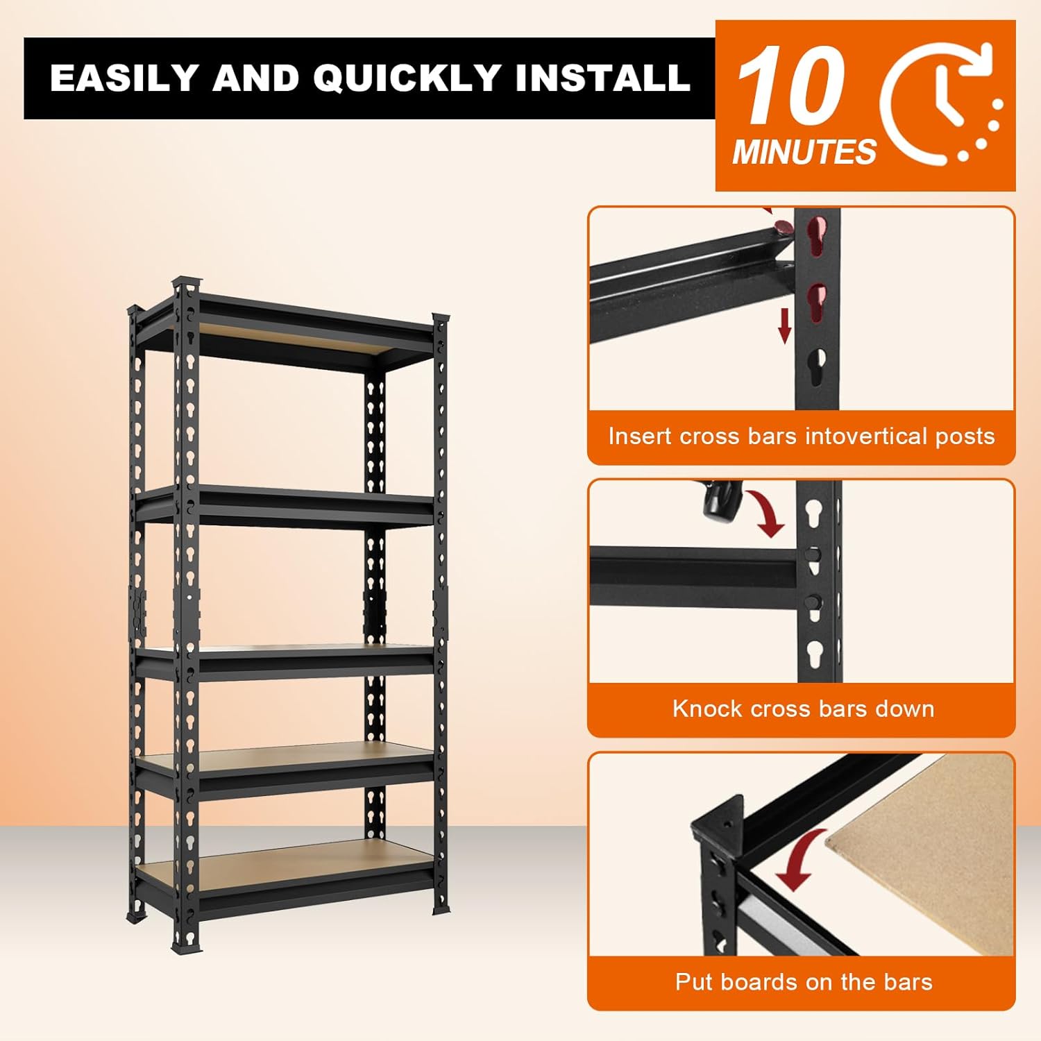- 59 "H x 28 "W x 12" D Multipurpose storage shelves: The garage shelves heavy duty shelving with perfect size is suitable for garage, pantry, closet, kitchen, warehouse, basement, living room, office, supermarket, commercial, school, library etc. The 5 tier metal shelving units and storage shelves not only expands your storage space, it makes your home clean and orderly and is your best choice for shelf organization for your business.