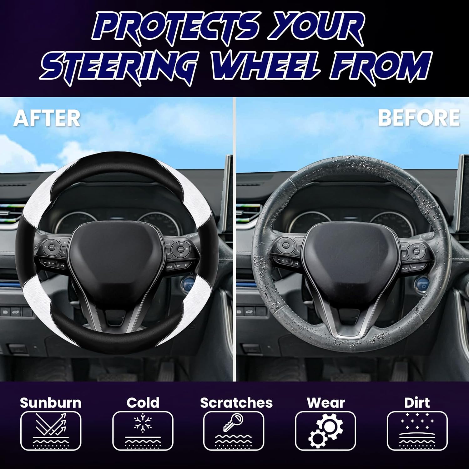 - ADD A PROTECTIVE LAYER TO YOUR STEERING WHEEL:Shield your steering wheel with UV-blocking technology, scratch-resistant surface, and wear reduction—all while maintaining buttery-soft tactile comfort for smooth driving control.