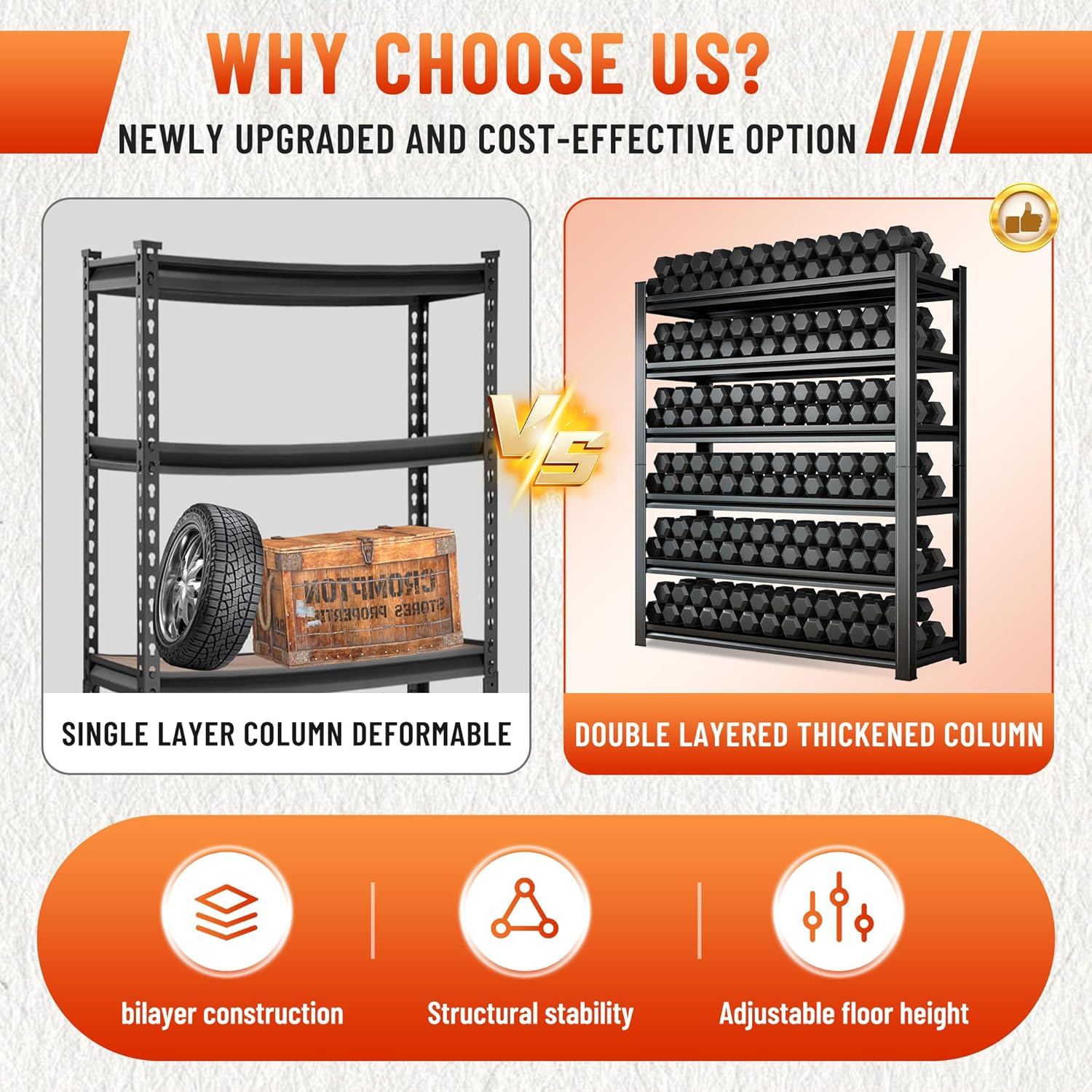 - 【Upgraded Dual-Layer Columns for Maximum Stability & Strength】 Our heavy-duty shelving features reinforced dual-layer columns that dramatically increase stability and load-bearing capacity. This smart design distributes weight evenly, eliminating warping or sagging over time, even under your heaviest tools and materials. Enjoy rock-solid reliability.