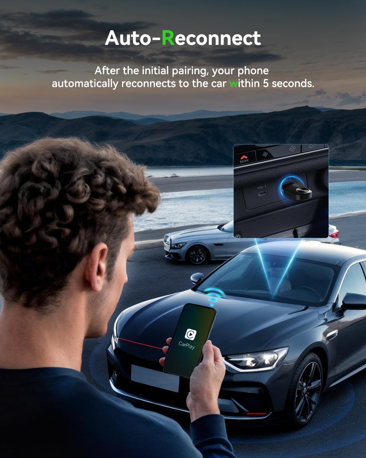 - 🔄Seamless Auto-Reconnect Function – Set it up once, and this wireless Android Auto and CarPlay adapter for iPhone will automatically connect every time you start your car. No manual pairing, no waiting—just instant, uninterrupted wireless access from ignition.