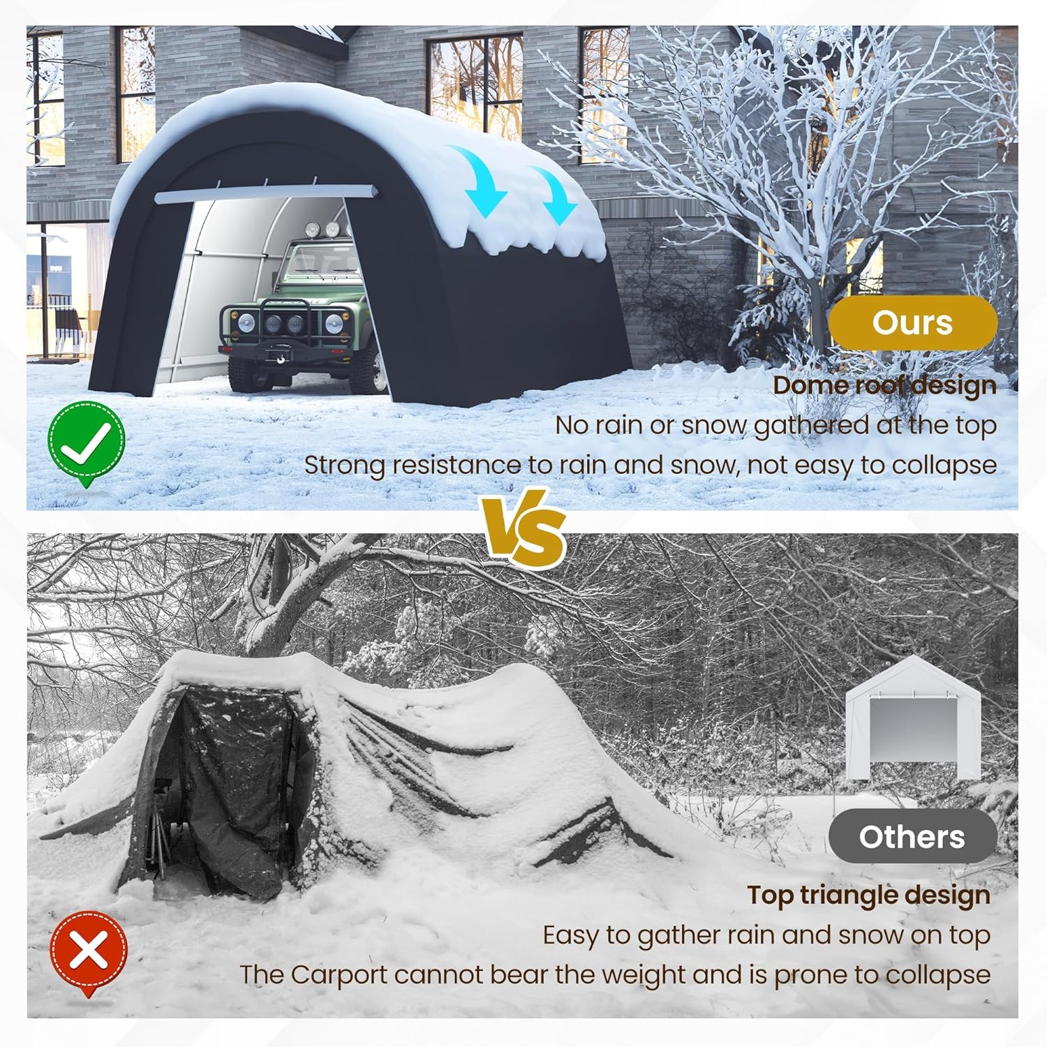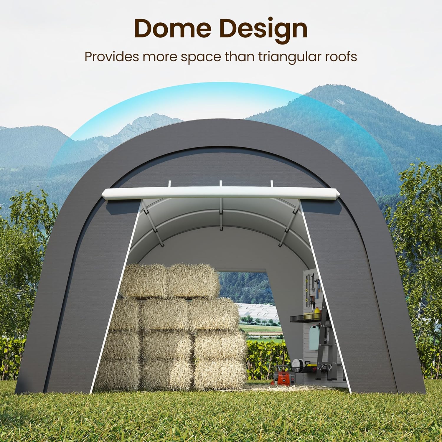 - DOMED CARPORT: 12x25 ft car port dome design prevents water and snow buildup, reducing structural stress and enhancing durability. The sleek, curved shape of the carport is more attractive and provides more interior space and better air circulation