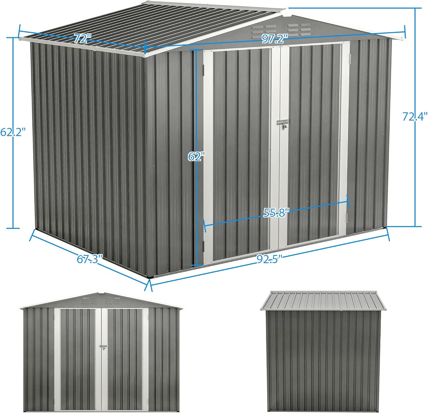- 【Spacious Storage Space】This 8 X 6-Foot Metal Shed Provides Ample Storage Space And Can Easily Accommodate Snow Blowers, Shovels, Outdoor Furniture, Bicycles, Gardening Tools And Other Items, Making It An Ideal Choice For Your Yard Tidying Up.