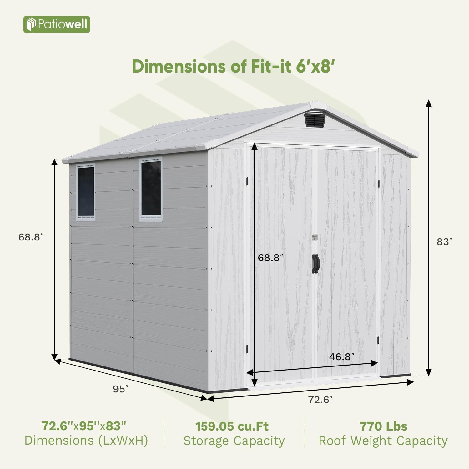 - Spacious 6x8 FT Outdoor Storage Shed: This extra-large resin shed (72.6"L×95"W×83"H) delivers massive storage capacity for all your outdoor needs. The roomy interior easily fits lawn mowers, bikes, and bulkier items with space to spare.
