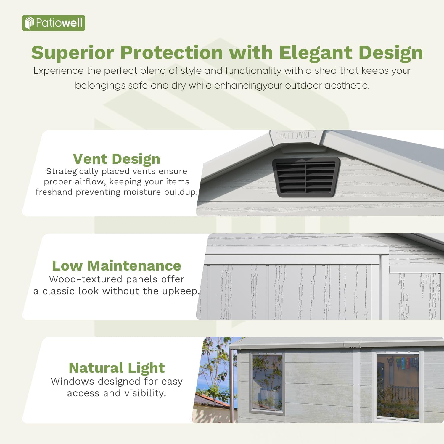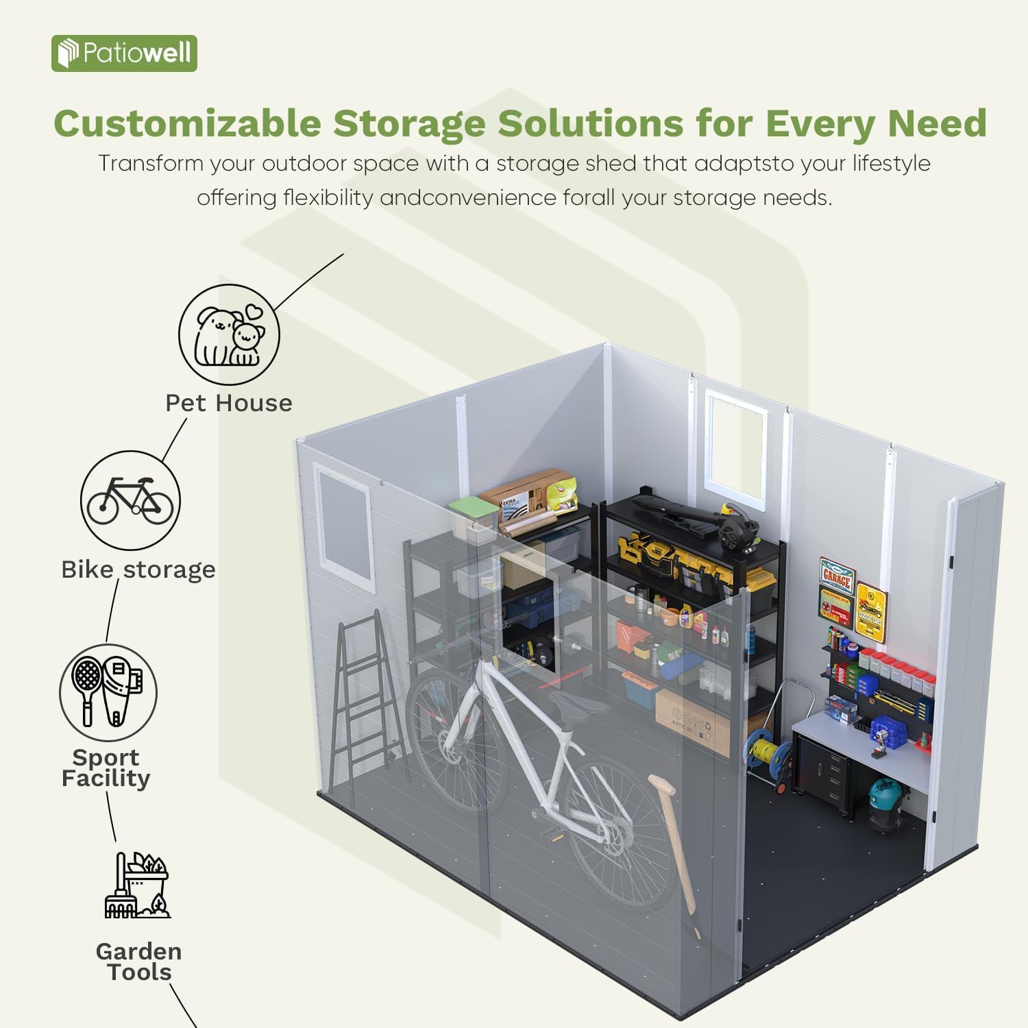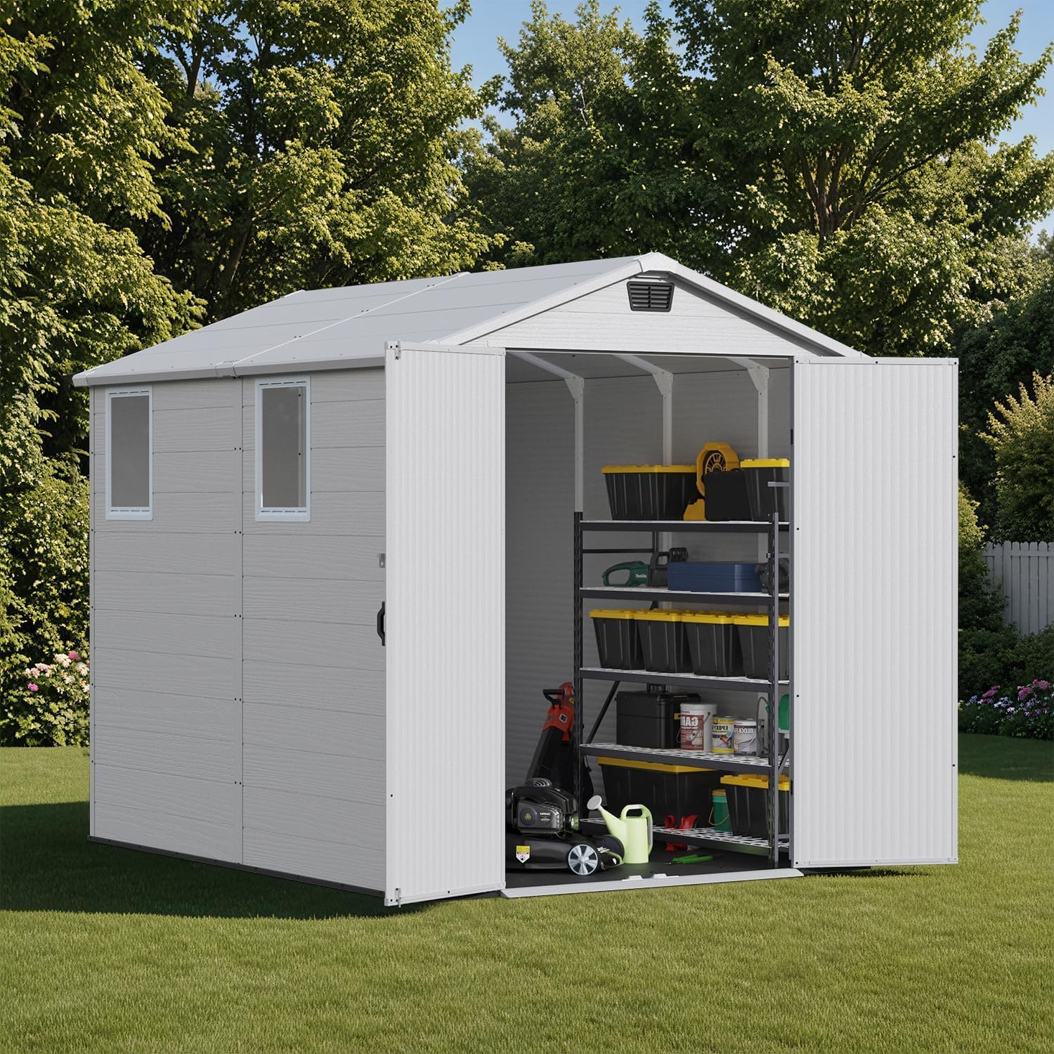 - Sturdy & Reliable Foundation: Built for strength and stability, this shed features a thick reinforced resin floor and heavy-duty frame designed to support even bulky equipment. The textured anti-slip surface maintains secure footing on uneven terrain while keeping stored items clean, dry and protected from ground moisture.