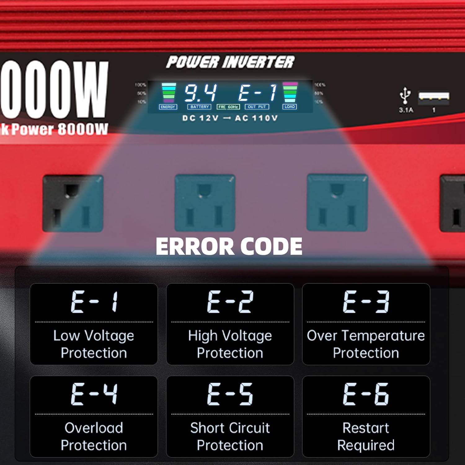 - INTELLIGENT LCD DISPLAY: In normal working state, the LCD Display will display the input/output voltage, battery capacity, load capacity and output frequency. When the inverter is in an abnormal state, the LCD Display will display the abnormal code. Such as, E-1: Low Voltage Protection, E-2: High Voltage Protection, E-3: Overtemperature Protection, E-4: Overload Protection, E-5: Short Circuit Protection, E-6: Repeated Faults Shutdown, Restart Required.