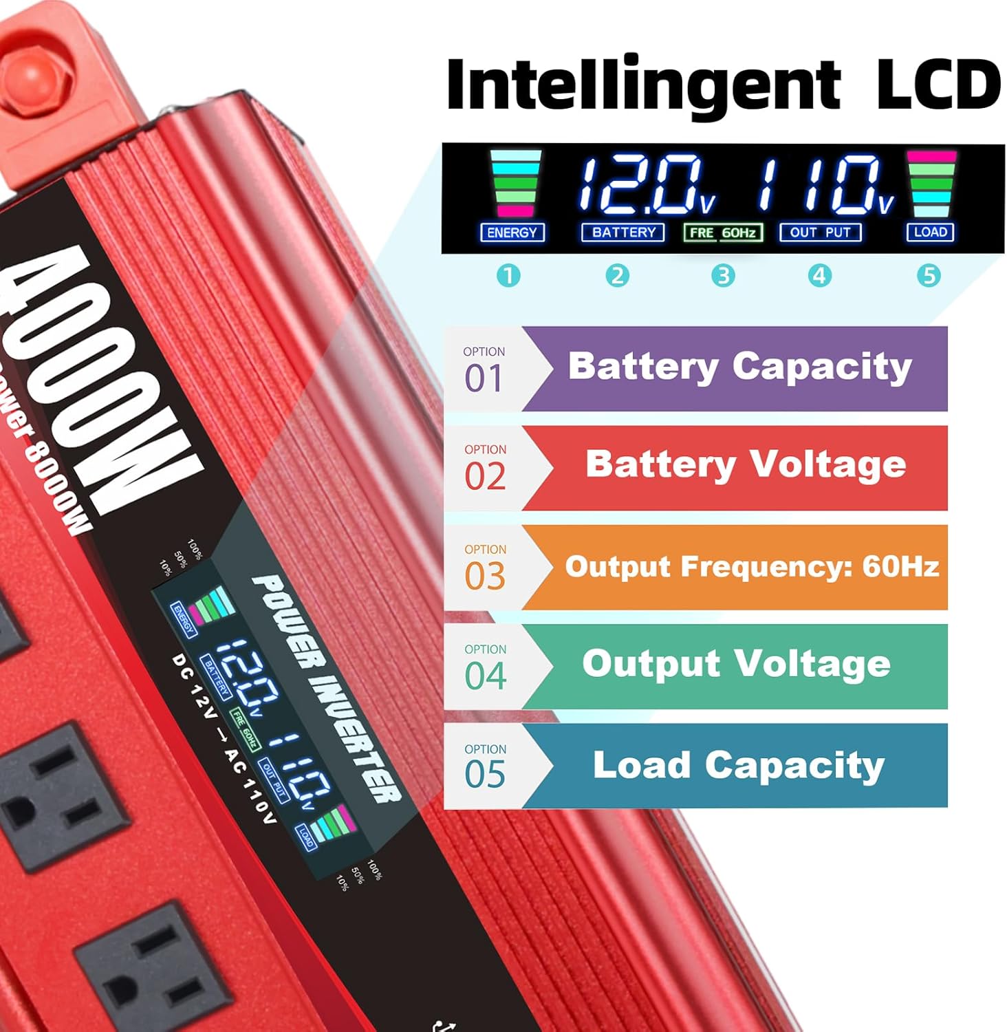 4000W Power Inverter 12V to 110V/120V DC to AC with LCD Display, Remote Controller 5 x AC Outlets and 4 x 3.1A USB Car Adapter for Car Truck Boat RV Solar System