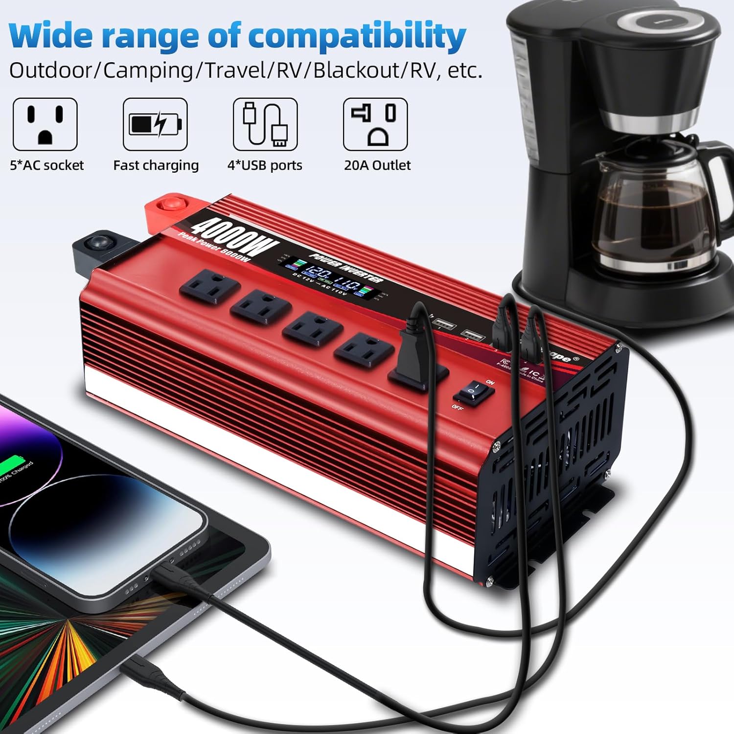 - WIDE APPLICATION: The sockets are designed to easily insert four large size plugs at the same time. 5 120V AC Outlets ideal for hair dryer, microwave, coffee machine, drill, TV, car refrigerator, LED lights, water pump, electric saw. Ideal for use on vacations, work trips, home or outdoors for emergency, outdoor activities and camping.