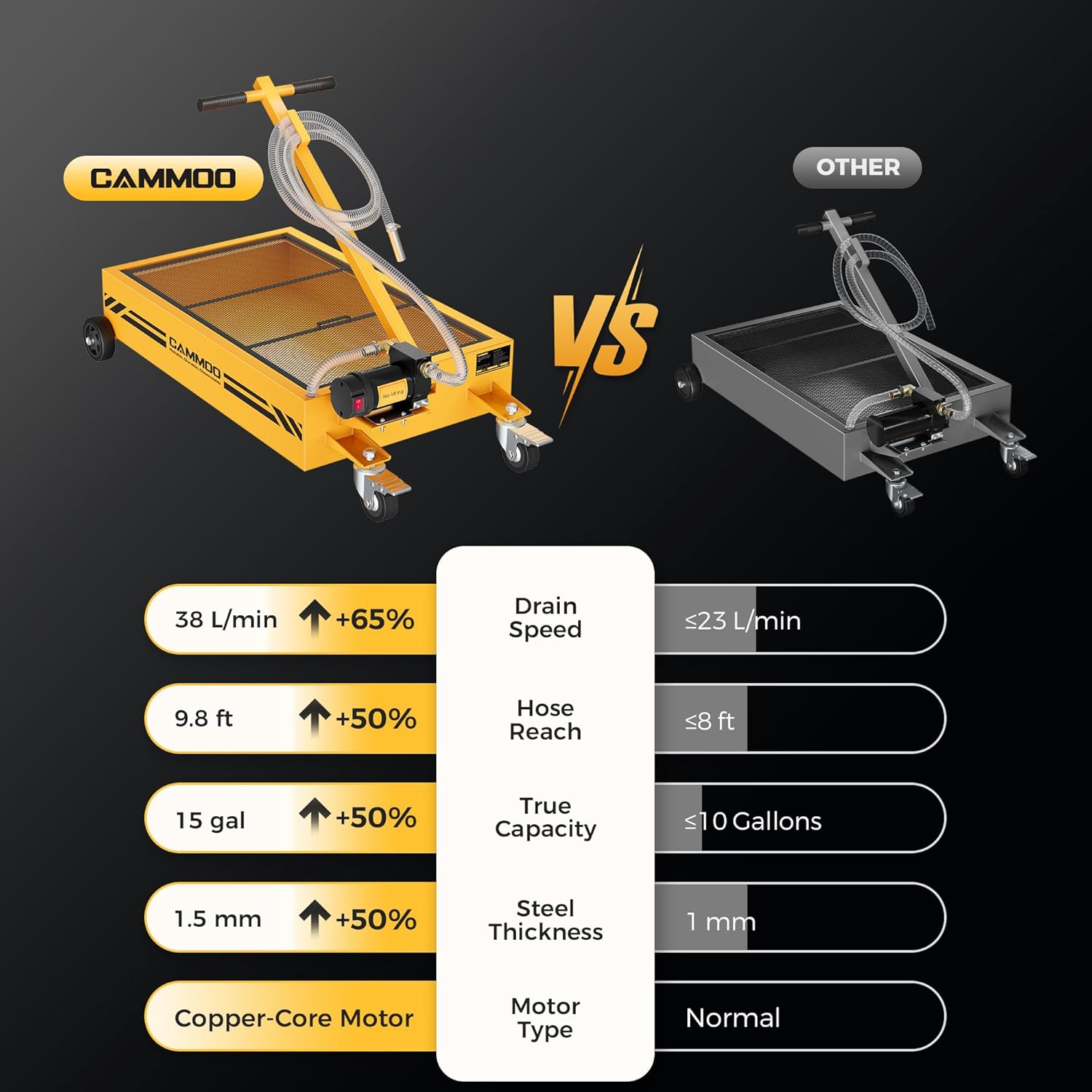 - Optimized Copper Motor:The copper motor features a 110V power supply and 200W maximum output, tipping the scales at 610.5g to stand heavier and more robust than standard motors in oil pans. This added heft translates to stronger performance: it delivers a powerful 38L/min flow rate, draining oil 65% faster to help finish jobs in less time. For busy shops, and weekend DIYers alike, this means boosted efficiency, reduced labor time, and smoother workflow—whether tackling back-to-back oil changes with oil pans or squeezing in a project at home. It is engineered to make every task quicker, easier, and more reliable.
