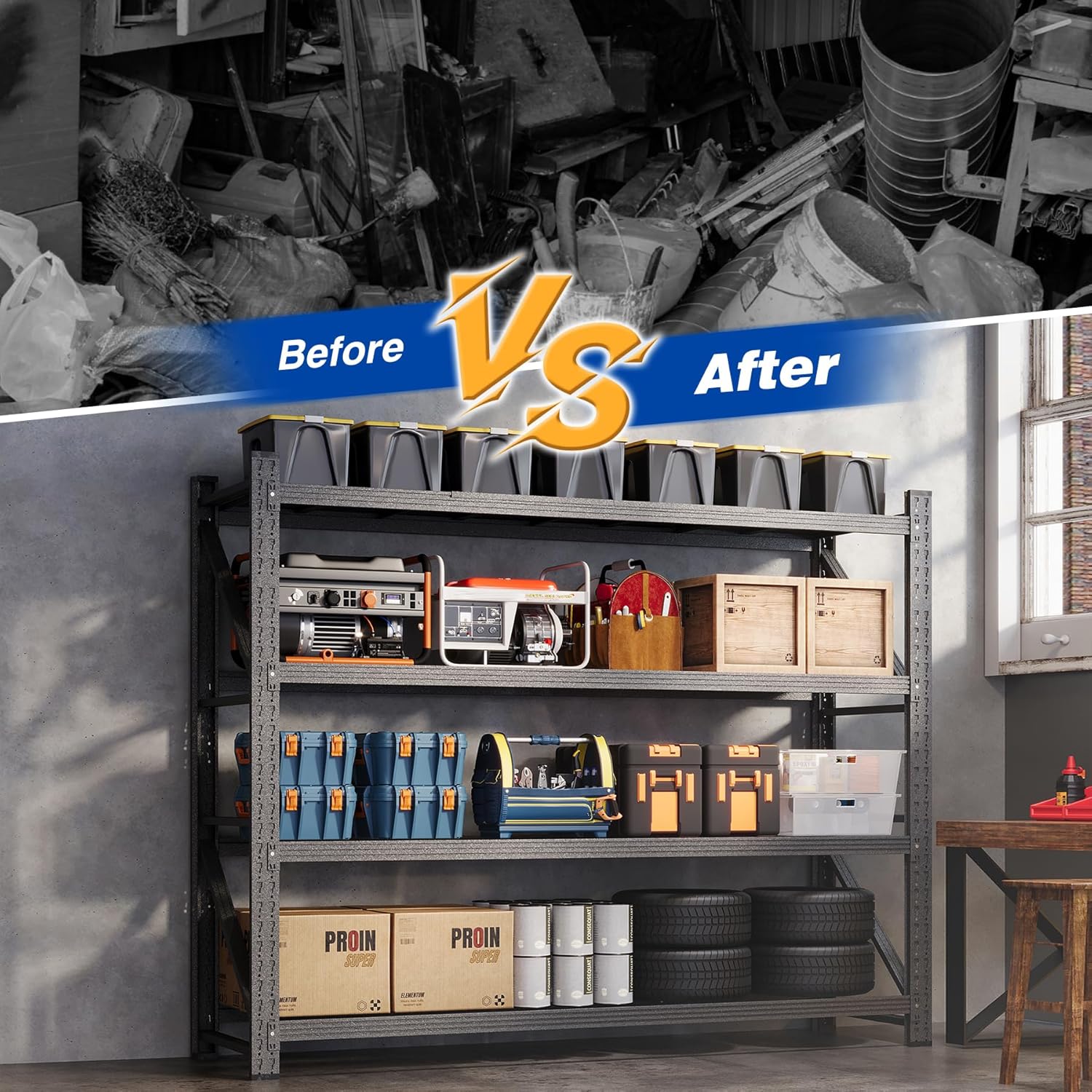 - Stronger stability: The heavy-duty garage rack is handled firmly on the sides. The diagonal of each heavy-duty shelf adds thickened reinforcement ribs to prevent loosening of the shelves, increasing overall stability, and storing heavy-duty tools and boxes is more stable and firm.