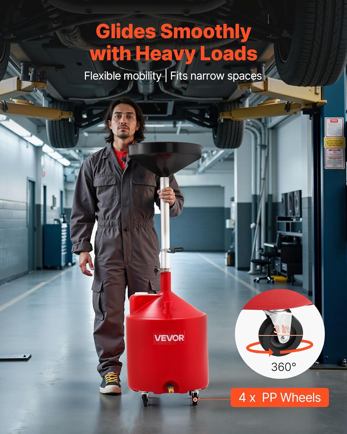 VEVOR 18 Gallon Waste Oil Drain Tank, Industrial Fluid Drain Tank with Adjustable Funnel Height, Portable Oil Drainer with Wheels, Fluid Fuel Transfer Drainage for Auto Repair Shops, Garages, Red