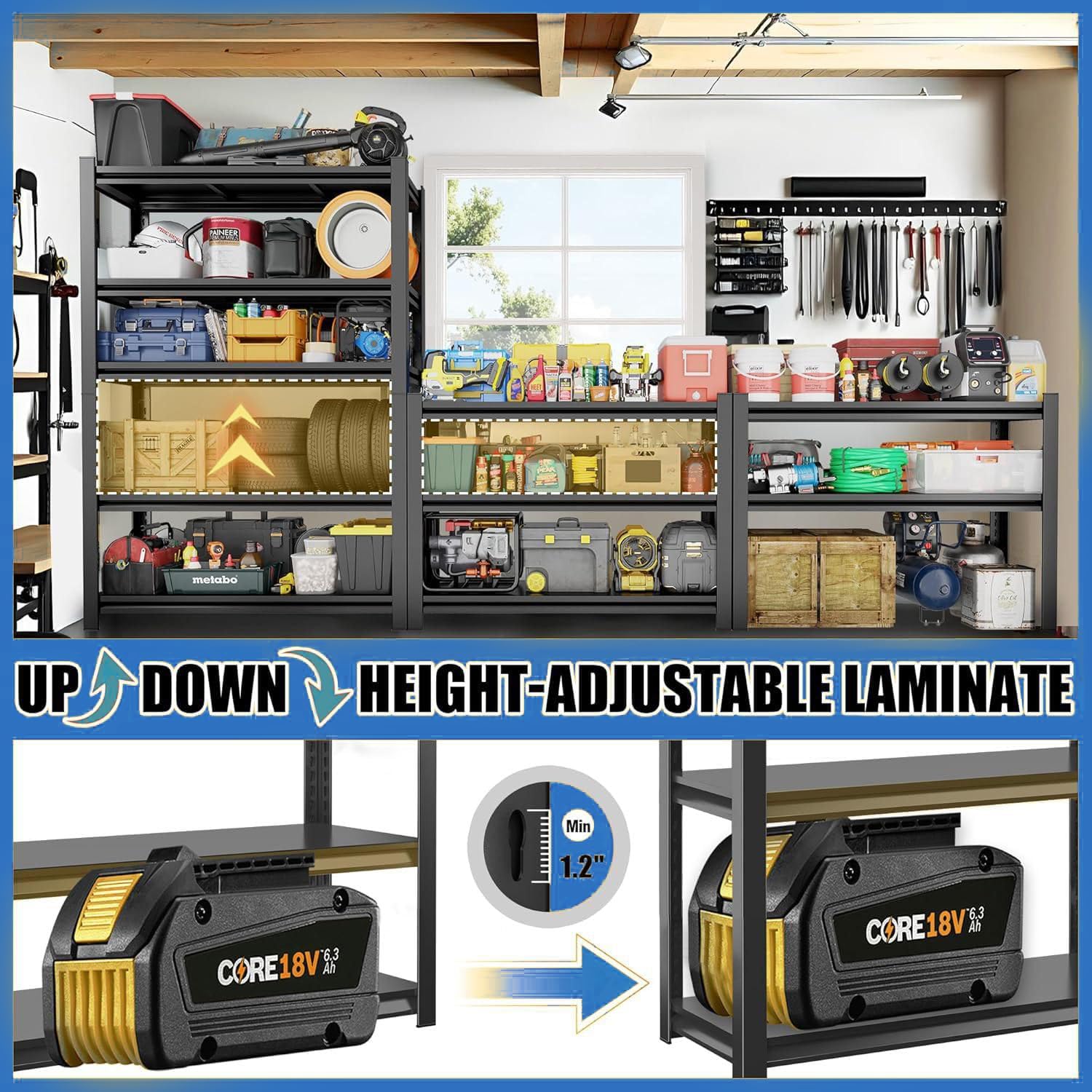 - 【Quick installation of a set of garage storage shelves in 10 minutes】This metal storage shelf adopts an interlocking design, which does not require any bolts or nuts for installation. It does not even require any installation tools. A set of 5-Tier metal shelves can be installed by hand in 10 minutes.