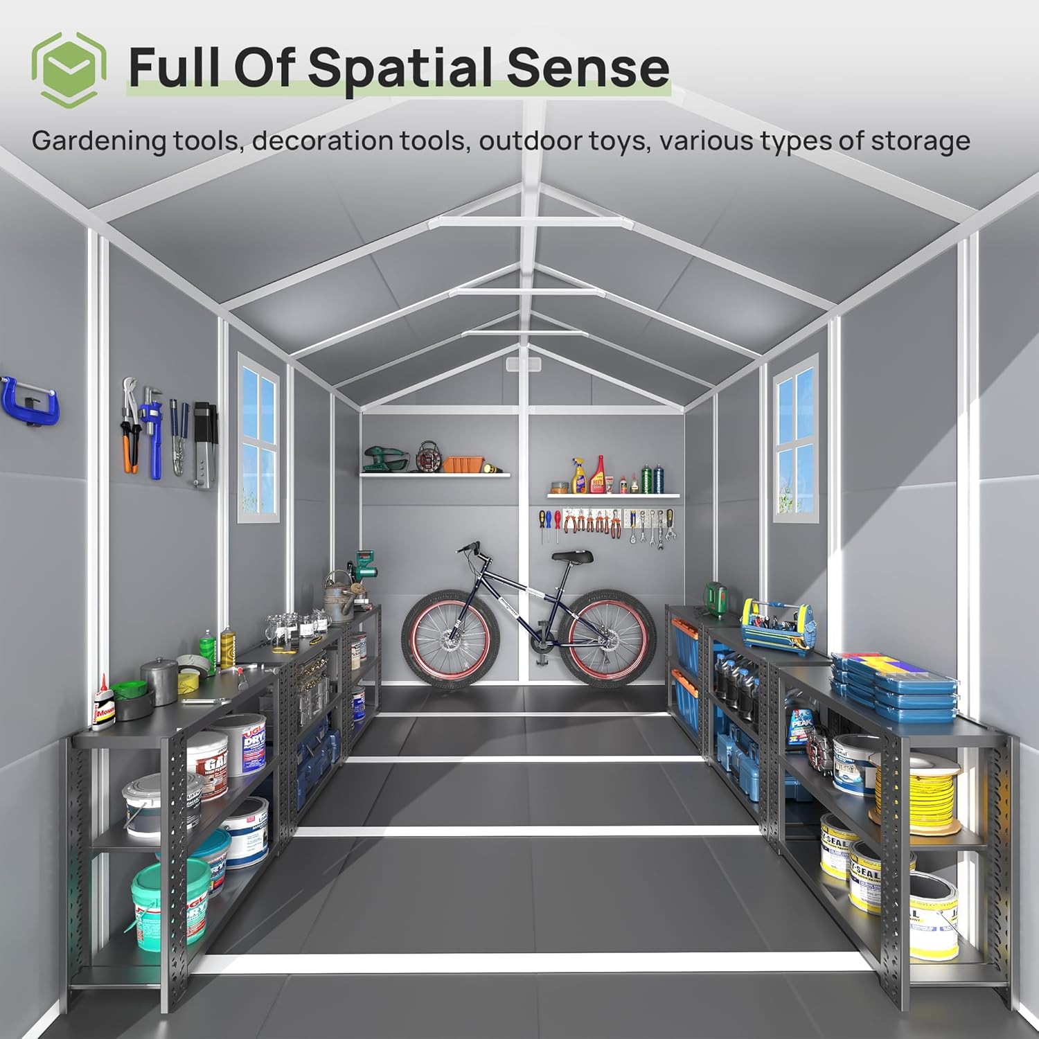 - Recyclable resin material: Compare iron and wooden, resin shed is corrosion-resistant, waterproof, rustproof and with UV protection for more than 8000 hours. Our storage shed is crafted with 12 MM hollow design polypropylene resin plastic of recyclable, less bending and puncturing, all weather conditions for customers.
