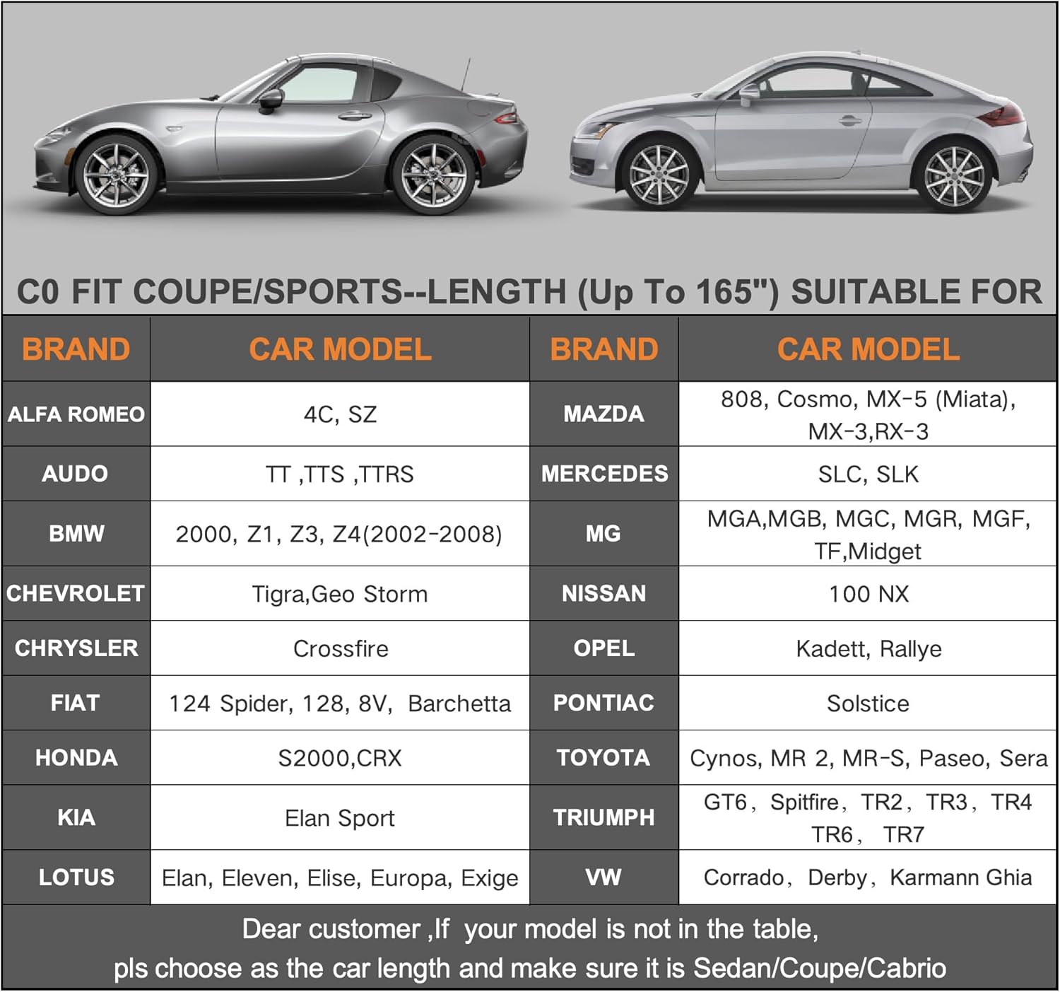 - 【Dimension C0】Universal fit for Sedan Coupe Sports Car which length is up to 165 inch. (NOT FOR HATCHBACK/SUV). Such as Mazda Miata Mx-5, Honda S2000,Toyota mr2 Spyder BMW Z3 etc. Come with a large enough and waterproof portable storage pocket to store the cover.