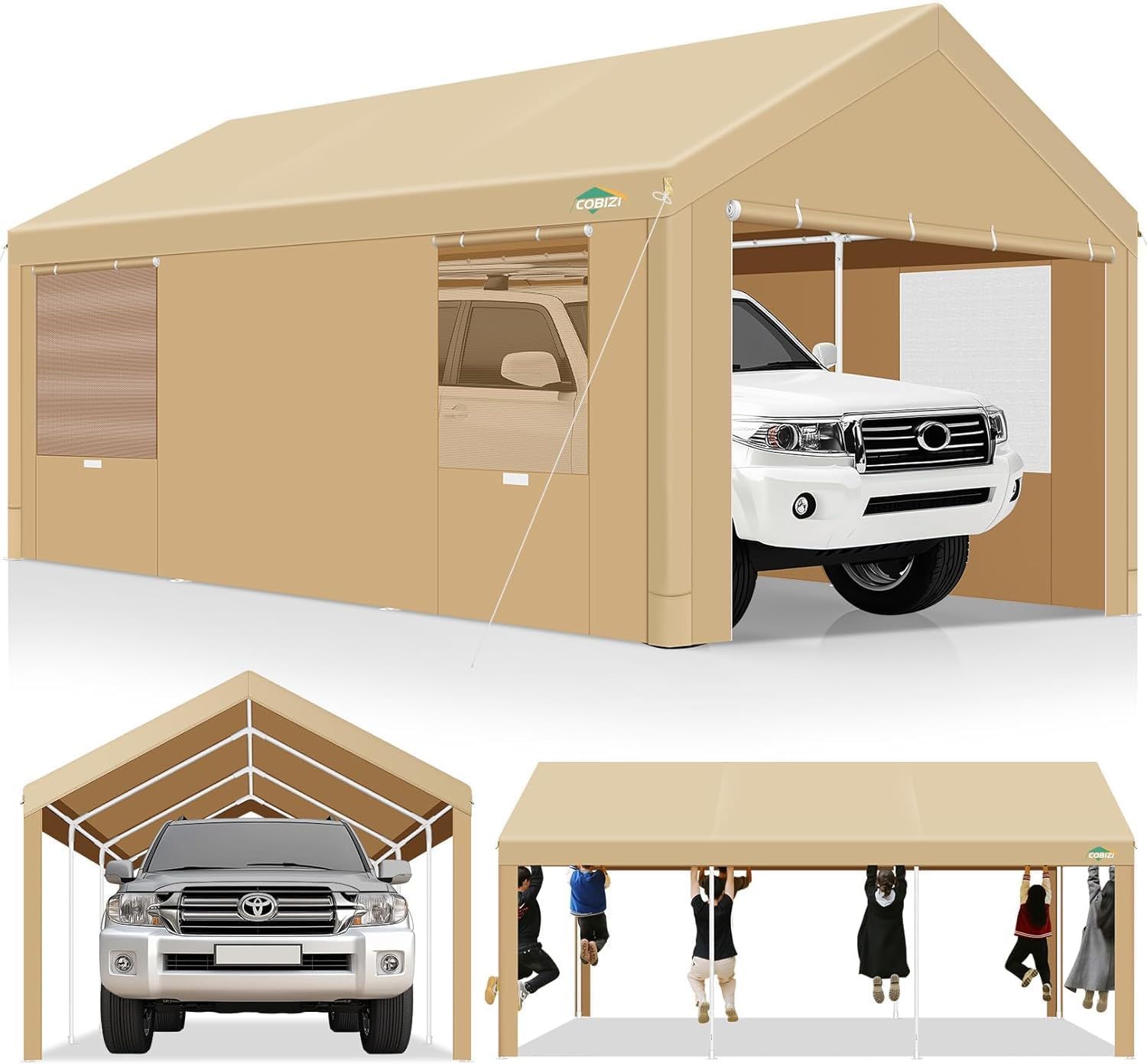COBIZI Carport 10x20ft Heavy Duty Portable Garage, 2.0 Powder Coated Frame(Better Than Galvanized), Waterproof Shelter with Removable Sidewalls & Windows, Built-in Sandbags, for Car/Boat/SUV, Khaki