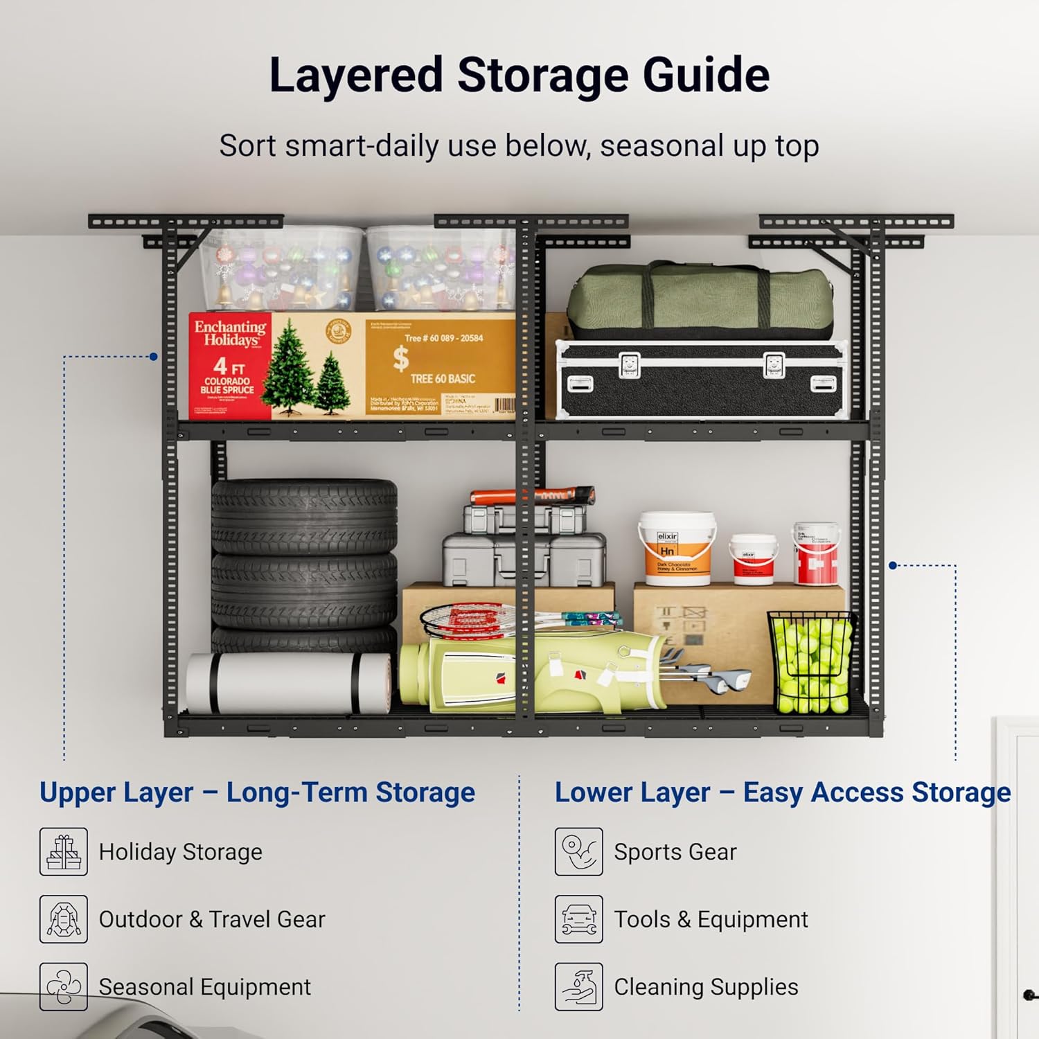 - Maximize Vertical Storage for Tall Garages – The FLEXIMOUNTS 3x8 2-Tier Overhead Garage Storage Rack creates twice the capacity of standard racks, turning unused ceiling space into a clutter free, organized area. Perfect for garage organization in 10–15 ft tall garages. For optimal clearance when parking or walking underneath, 2-tier racks are not recommended for garages under 10 ft.