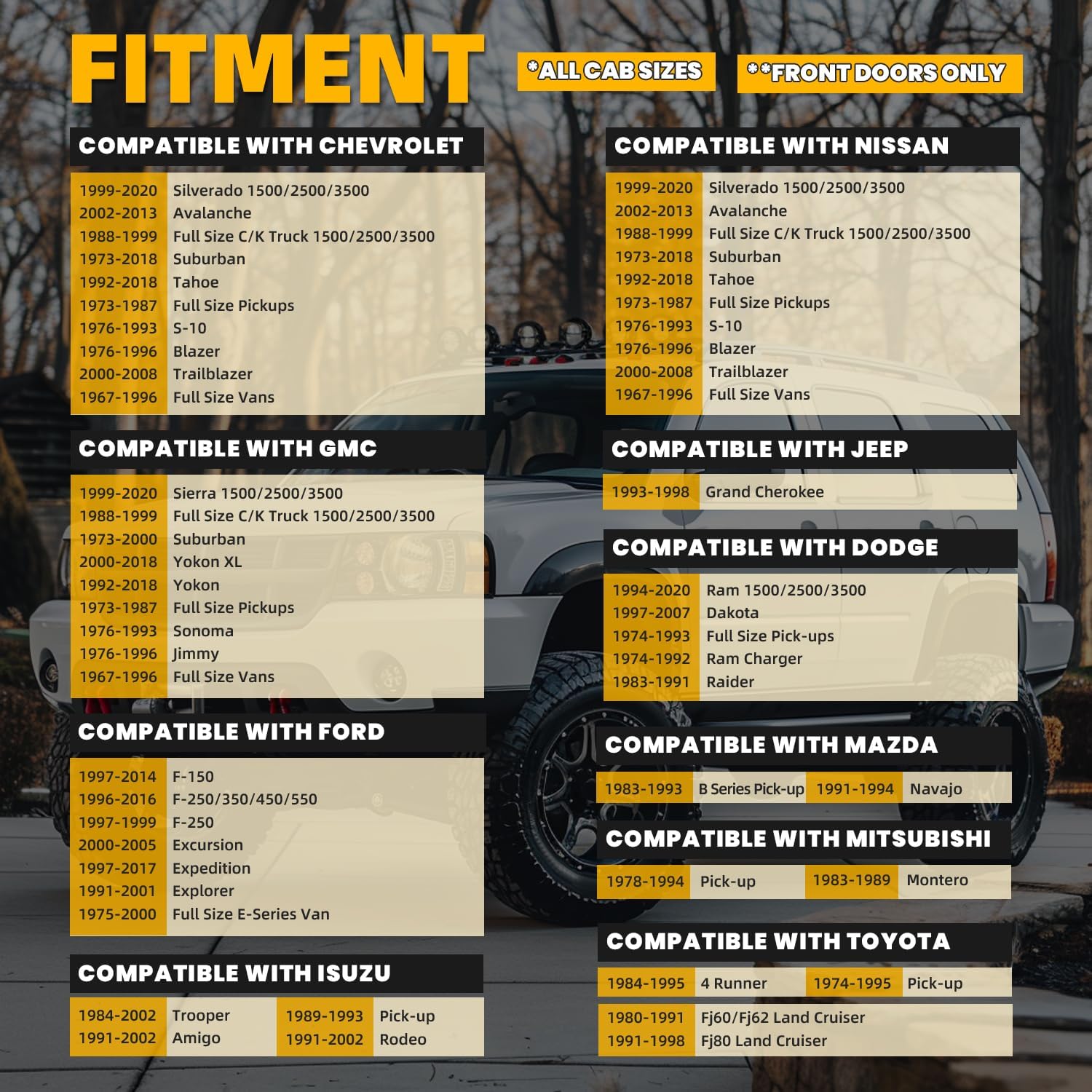 - Superb Adaptability: This universal side step fits most truck and SUV, compatible with 1967-2020 Chevy (Chevrolet) & GMC, compatible with 1975-2017 Ford, compatible with 1974-1998 Toyota, compatible with 1974-2020 Dodge, compatible with 1993-1998 Jeep, compatible with 1972-2004 Nissan, compatible with 1978-1994 Mitsubishi, and compatible with 1983-1994 Mazda models