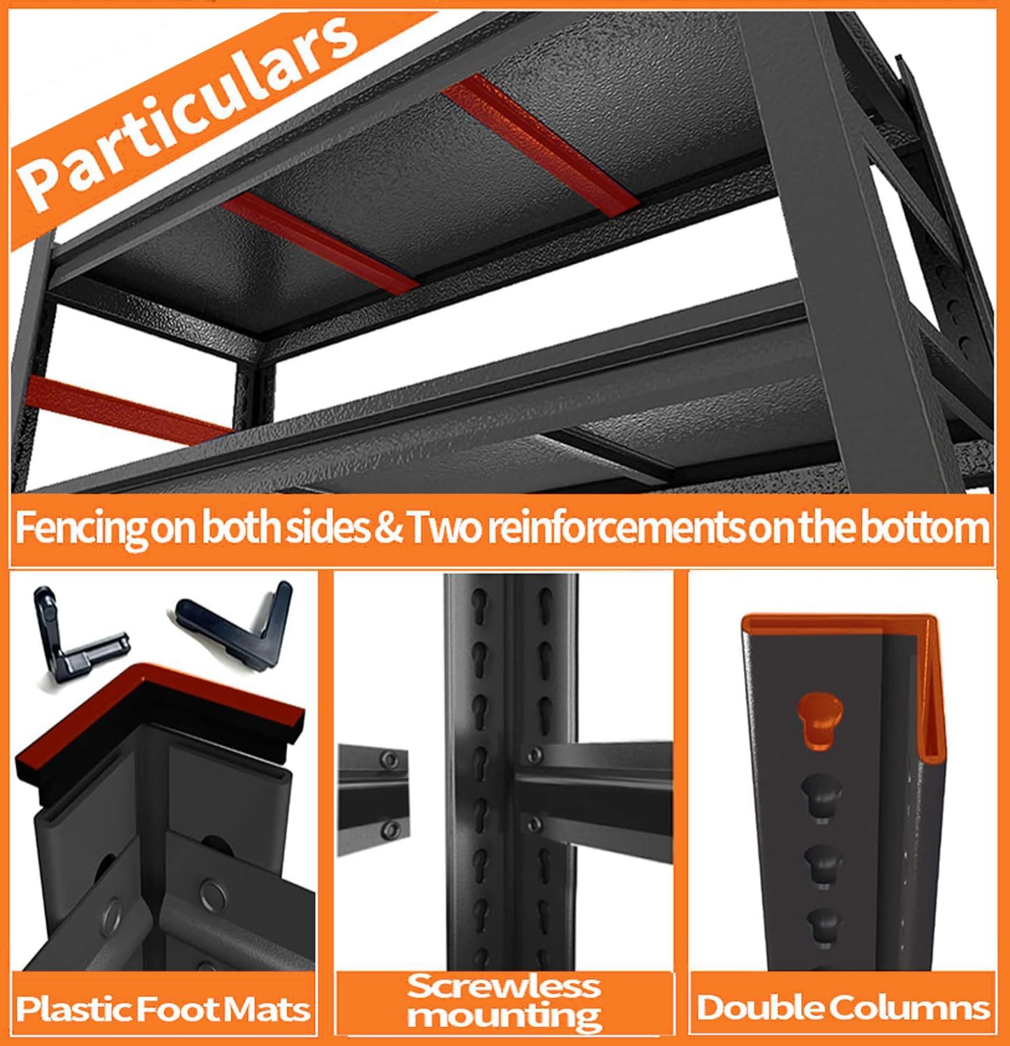 - 【Quick installation of a set of garage storage shelves in 10 minutes】This metal storage shelf adopts an interlocking design, which does not require any bolts or nuts for installation. It does not even require any installation tools. A set of 5-Tier metal shelves can be installed by hand in 10 minutes.