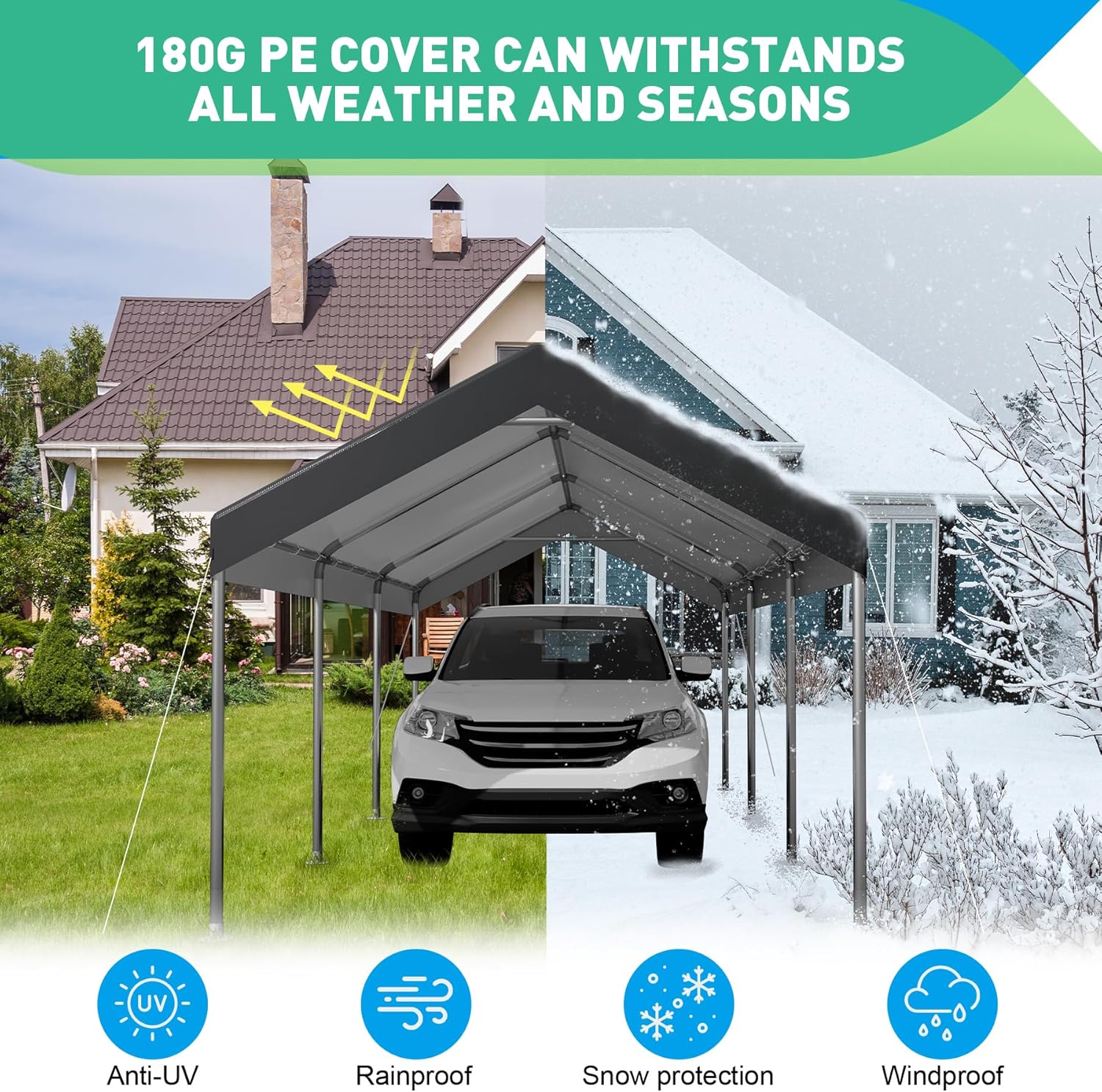 - 【ALL-SEASON PROTECTION FROM THE ELEMENTS】: Stay shielded year-round with the 180g waterproof canopy cover, crafted from extra-thick polyethylene fabric. This heavy duty all weather carport tent protects vehicles from sun, rain, dust, hail, and snow, preserving their condition. As a versatile 10 x 20 canopy tent, it delivers reliable defense against the elements, ensuring your car, boat, or bike remains safeguarded.