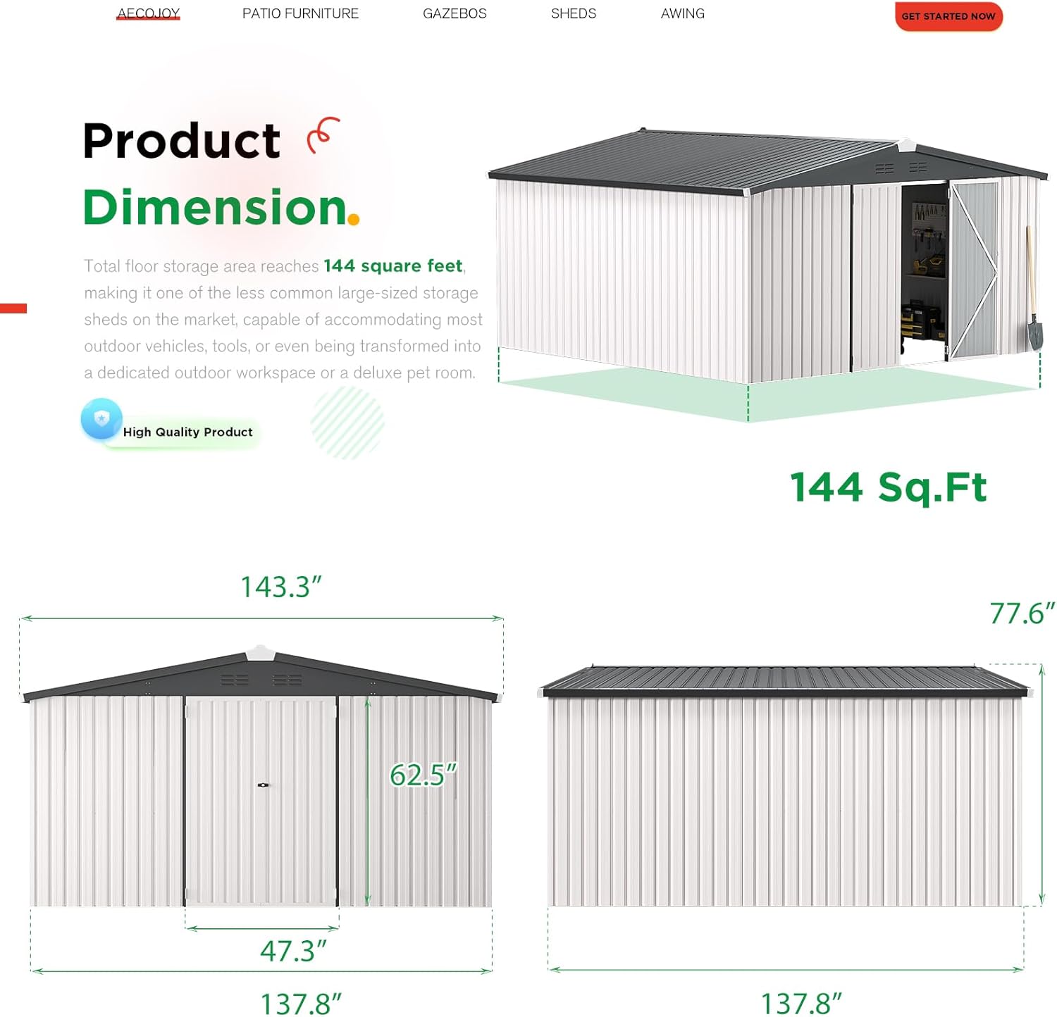 - Ample Storage Space: Boasting a total floor storage area of 144 Sq.Ft, our storage shed is among the larger options available, capable of accommodating a variety of outdoor vehicles, tools, or even serving as a dedicated outdoor workspace or deluxe pet room.