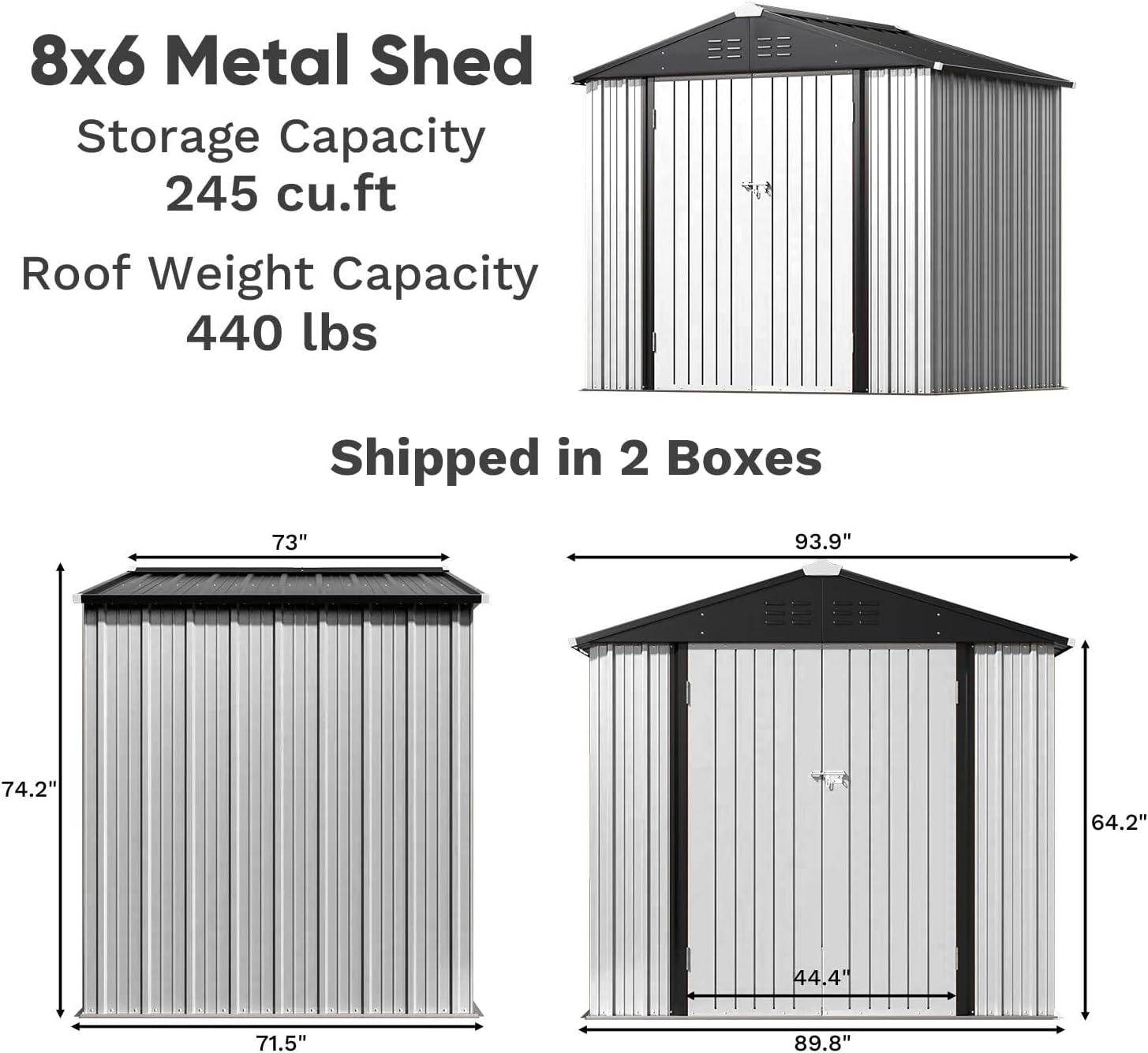 Greesum 8×6FT Outdoor Storage Shed, Metal Patio Storaged Sheds with Lockable Doors, Sheds & Outdoor Storage for Bike, Backyard, Pool and Garden, White