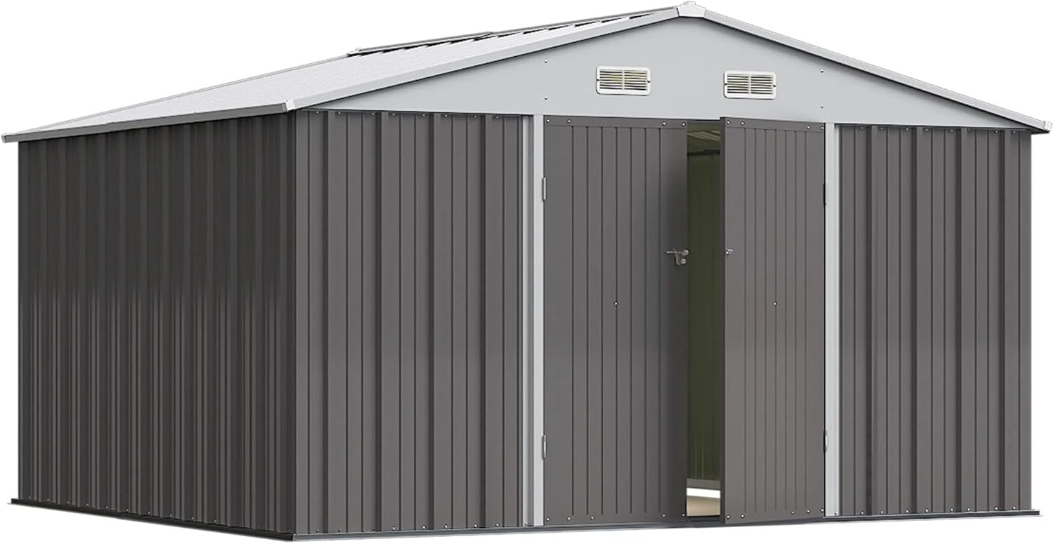 Greesum 10×8FT Outdoor Storage Shed, Metal Patio Storaged Sheds with Lockable Doors, Sheds & Outdoor Storage for Bike, Backyard, Pool and Garden, Gray