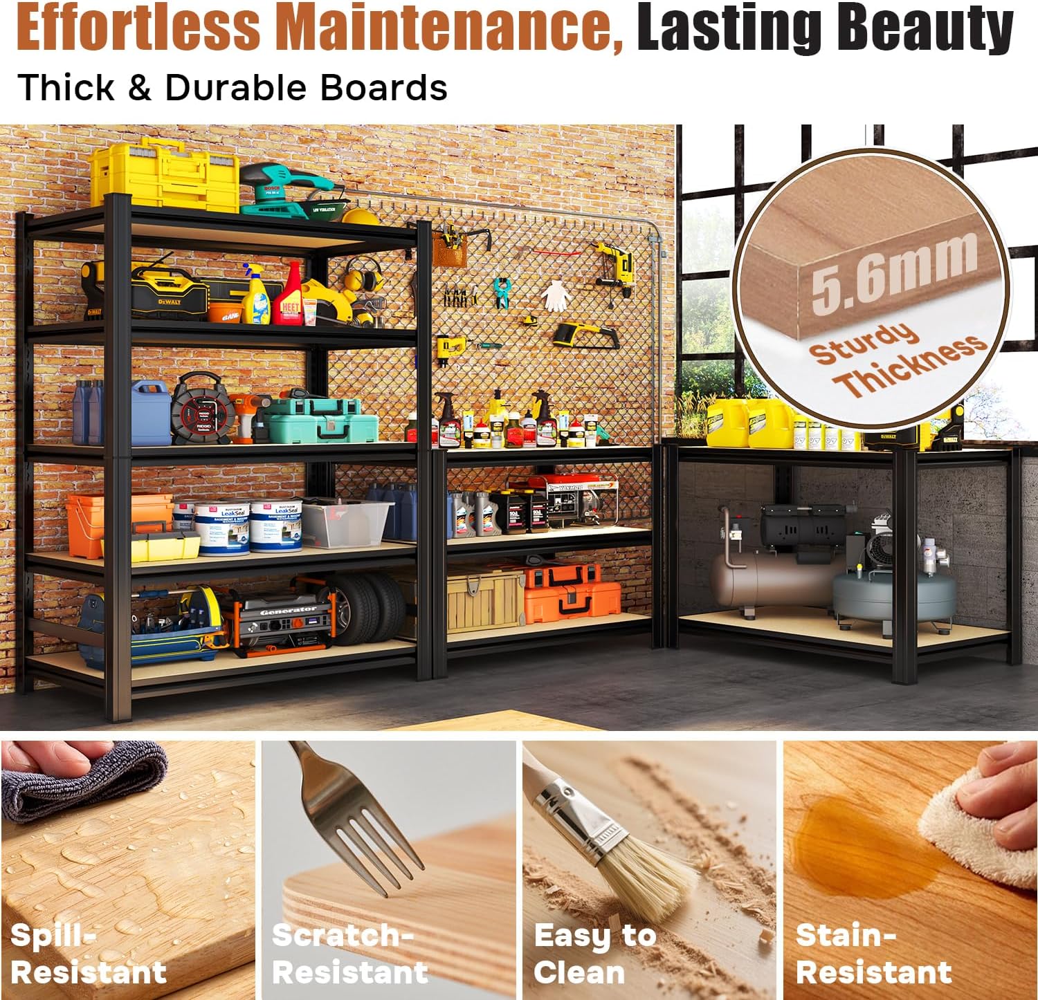 - 💪 COMMERCIAL-GRADE STRENGTH, 2500 LBS BEAST MODE – Don't settle for flimsy shelves. Our garage shelving is forged from high-quality, thickened cold-rolled steel and features an exclusive double-layered column design for unmatched stability. It effortlessly supports a massive 2500 LBS total capacity (500 LBS per shelf). From heavy power tools and packed totes to engine parts, store your heaviest items with absolute peace of mind. Conquer your clutter with confidence!