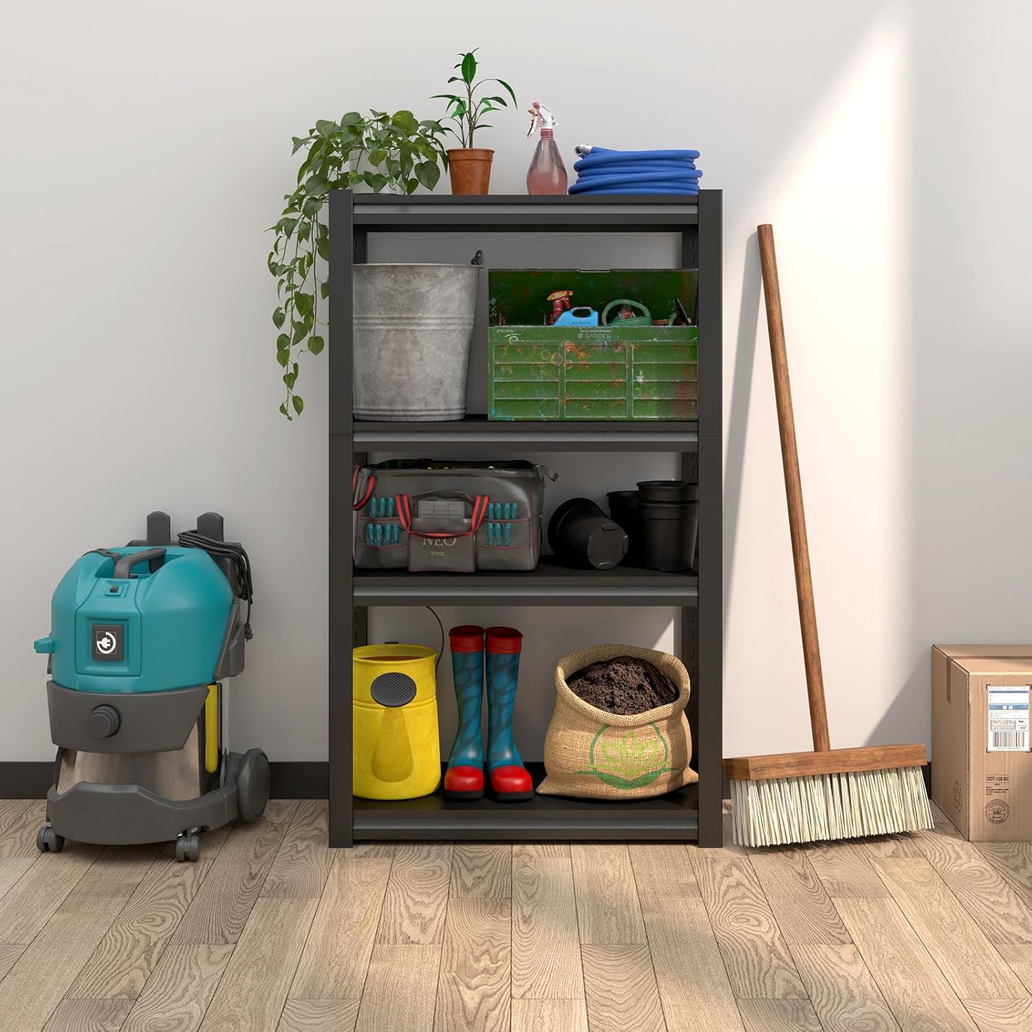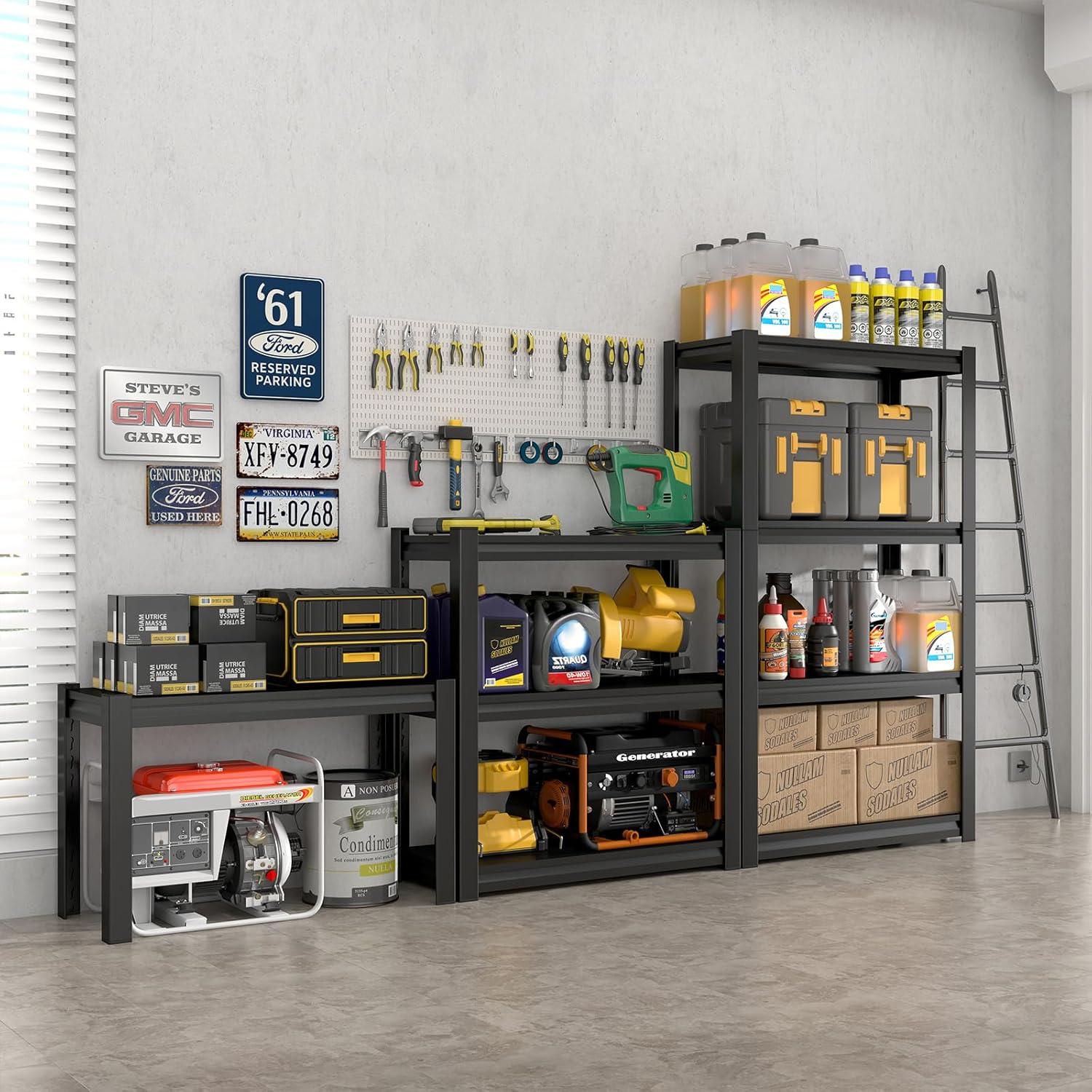 - 【Durable Quality】This garage storage racks is made of thickened metal material. Each shelf can easily support 250 pounds, with a total load capacity of 1,000 pounds. The sturdy design allows the metal shelving unit to securely hold various heavy items, helping you keep your space neat and organized.