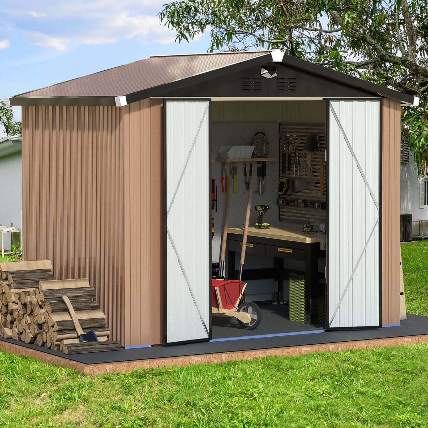 - 【Great Value Extras】 This metal storage shed comes with a solar light, leaf bag, floor mat, and handle lock, offering unbeatable value with all the extras you need for a complete setup.
