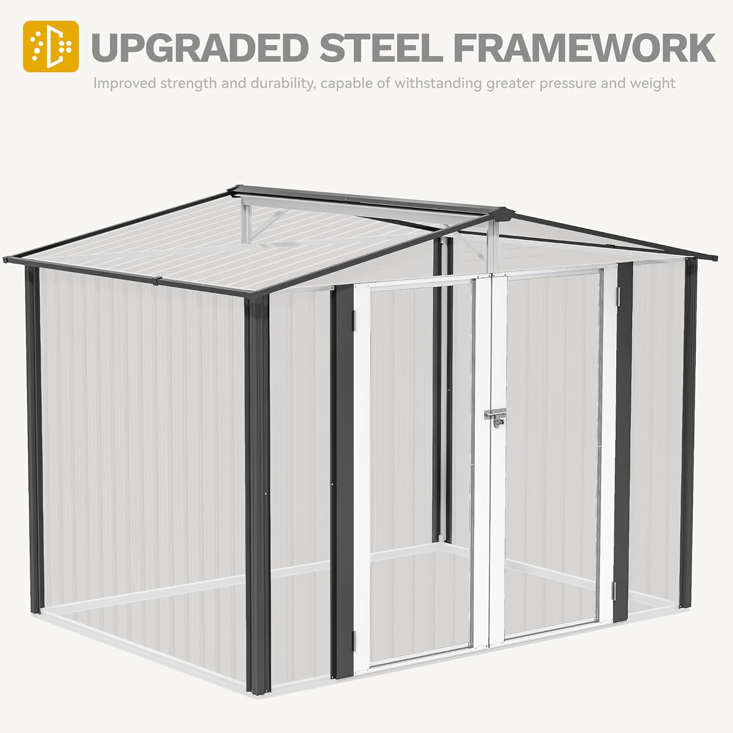 - Galvanized Steel Construction: The backbone of our outdoor storage shed is the high-grade galvanized steel, reinforced with 0.25mm thick panels; This combination ensures a resistance against corrosion, water, and wind, making it a durable choice for enduring the rigors of the outdoors over time